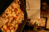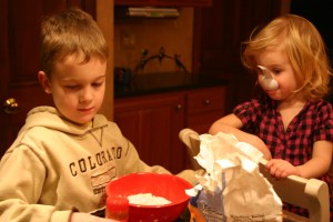 Well here it goes…our first attempt to try new recipes from around the globe and venture into the world of blogging. Mr. N calls it “cooking around the world.” He was the first to select our cooking destination, and our budding little foodie selected Mexico. We didn’t want to pick the usual suspects (burritos, tacos, enchiladas or fajitas), so instead we picked a more obscure recipe (at least it was unknown to us) – Cinnamon Fried Chicken with Roasted Potatoes. It was deemed an “easy” recipe – with a 6-year old and 2-year old in the kitchen we’re likely to pick the “easy” options for quite some time. The prep was definitely made for the little ones. Both Mr. N and Miss A loved getting to measure the spices, which included flour, cinnamon, cayenne pepper, nutmeg, ground cloves and salt. Miss A took a liking to it immediately and wasn’t afraid to double-dip her stirring spoon. (Fortunately no one has a cold this week!) Mom and Dad cleaned and dipped the chicken breasts (don’t want to spread raw chicken germs around the house), and the seasoned chicken with potato wedges were tossed with canola oil and placed in a roasting pan. The only downside of the recipe was that it took an hour and 15 minutes to bake (on the convection setting) and that made for a long, hungry wait. When we make this again, we’ll start it much earlier! About 20 minutes in to the baking, the aroma of cinnamon, cloves and nutmeg filled the kitchen. We were off to a good start. When we finally sat down to eat, the kids were definitely hungry (and willing to eat anything!). Fortunately the meal was a big hit; although the potatoes, while I enjoyed them, weren’t as highly regarded as the chicken. Everyone seemed happy with our first adventure and agrees it’s one to keep in circulation. Mr. N gave the chicken our highest honor of 4-spoons, Mom and Dad agreed it was worthy of 3-spoons and Miss A – well, she ate it so we’ll say she agrees with Mr. N and gives it 4-spoons. We’ve got one more week, and one more meal, of Mexican cuisine. I think we’re all looking forward to it already!