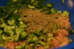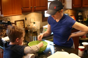 After Miss A’s nap, we began the pie filling. A blend of chicken, feta, eggs, scallions, dill, celery and spices. Mr. N assisted with his favorite activity – chopping! And Miss A helped mix all of the ingredients together.