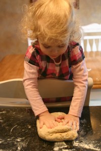 The phyllo we chose was a whole wheat phyllo. We used a combination of whole wheat flour and bread flour, salt, baking soda and the water and olive oil. The dough mixed together easily and required about 5 solid minutes of kneading to make it smooth and ready for refrigeration. It needs to be refrigerated for at least an hour and up to 3 days. We refrigerated ours for about 2 hours – the duration of Miss A’s naptime today.