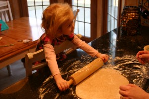 With our pie ready for baking, we cleaned up the kitchen, popped it in the oven and had an hour for free time. Dad went to broomball; Mr. N spent his time drawing his “dream house” that was at least 12 notebook pages tall and complete with a recording studio, indoor pool and bouncy ball room; Miss A split her time between “i-sizing” with me and playing Mr. N’s Lego’s; and I got in some laundry and exercise.