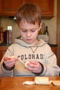 Mr. N separated the biscuits and then he and I wrapped them around the sausages.