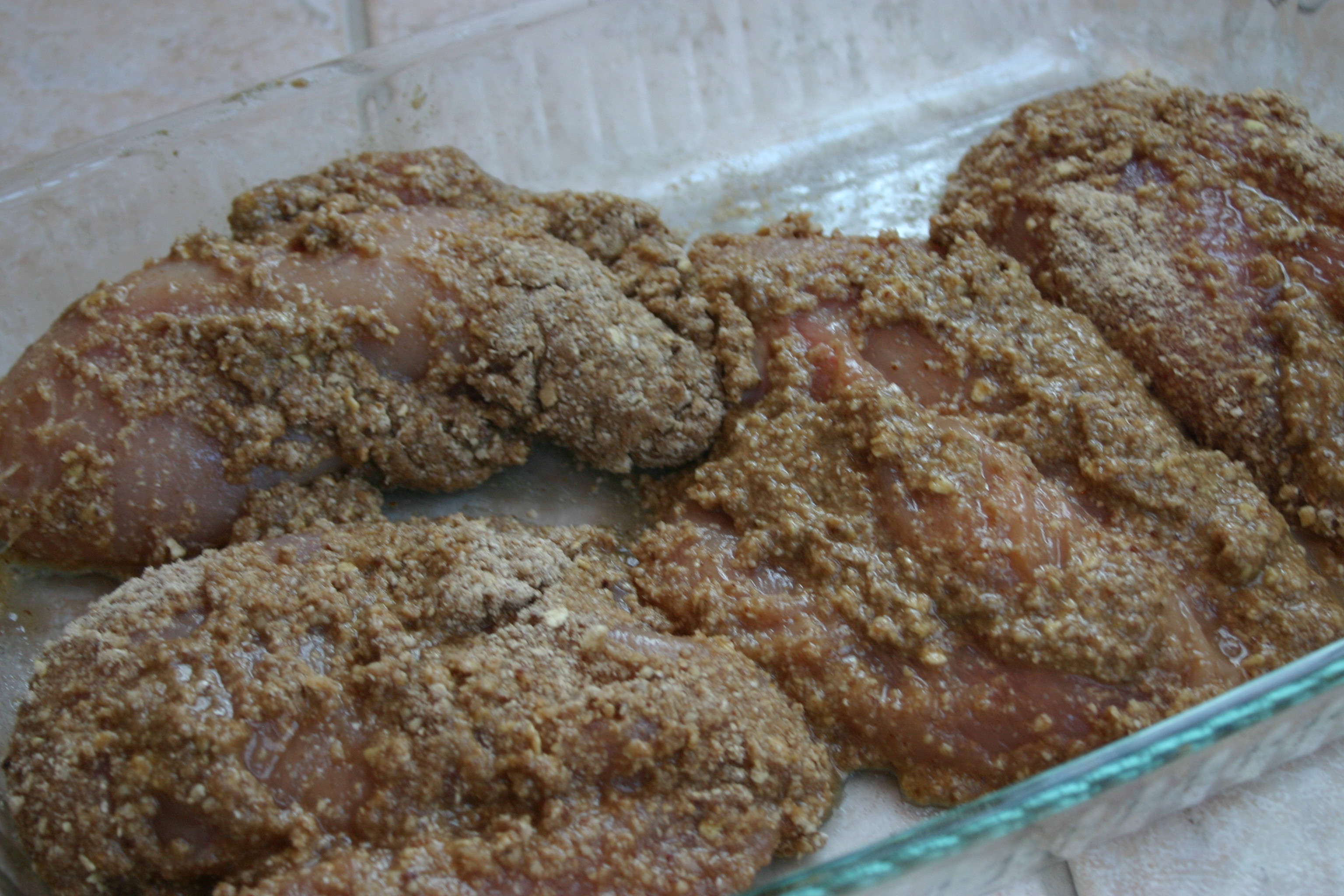 Next Mr. N and Miss A dipped the chicken breasts in the maple syrup and coated them with the oats/pecans.