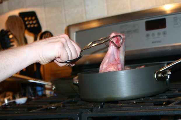 The foundation of this recipe came from a New Zealand recipe site Recipes for Beef and Lamb, but based on our reading of multiple recipes we decided to get creative. The first step in the process involves browning the lamb shanks in oil. Mr. N and Miss A really aren’t ready for this type of stove work yet, so for a treat Mr. N got to handle the photography.