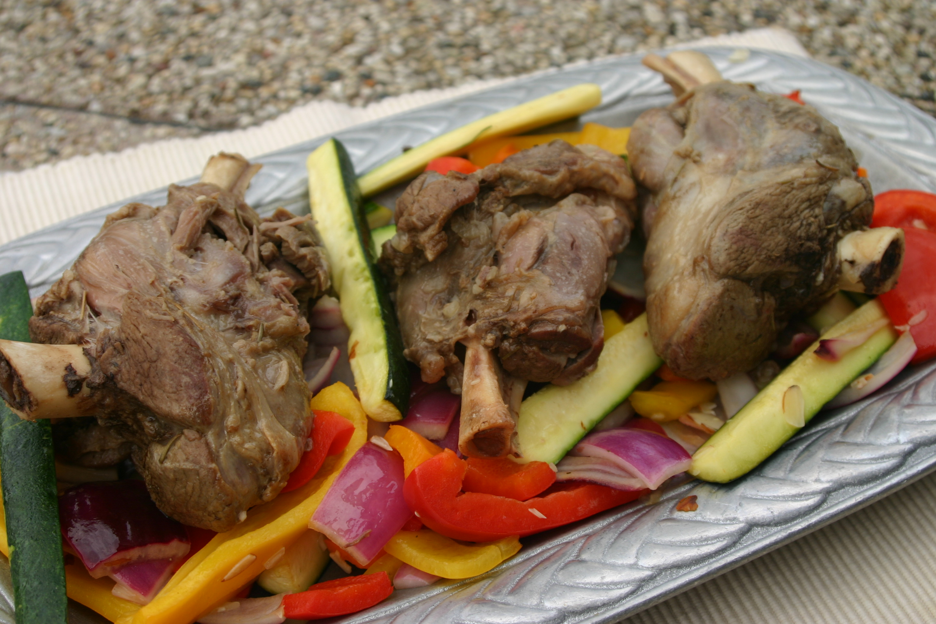 We covered the shanks with a tight-fitting lid and simmered for 2 hours and 20 minutes. I rotated the shanks about every half an hour. During the last 30 minutes of the simmering, Miss A and I sliced up some veggies for an oven-roasted side dish. Miss A took care of shaking up the olive oil,  balsamic vinegar and seasonings for the veggies.