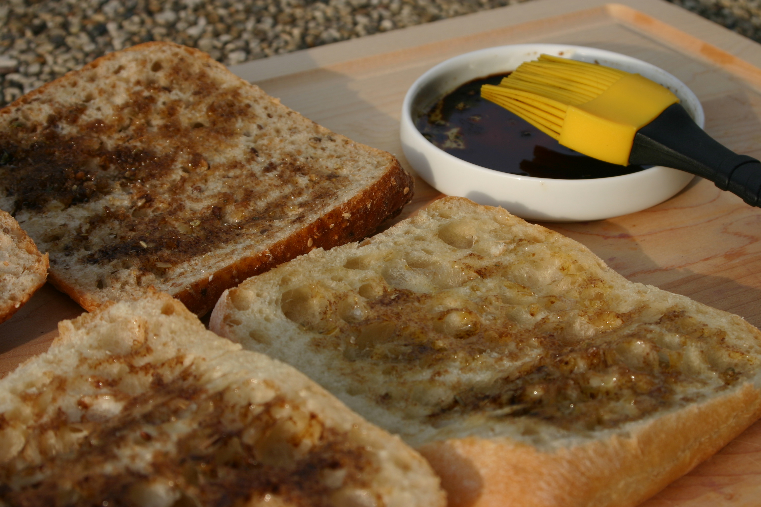 While the tomatoes are simmering, brush the bread with a combination of olive oil, balsamic vinegar and oregano. Bake at 375F for 10 minutes.