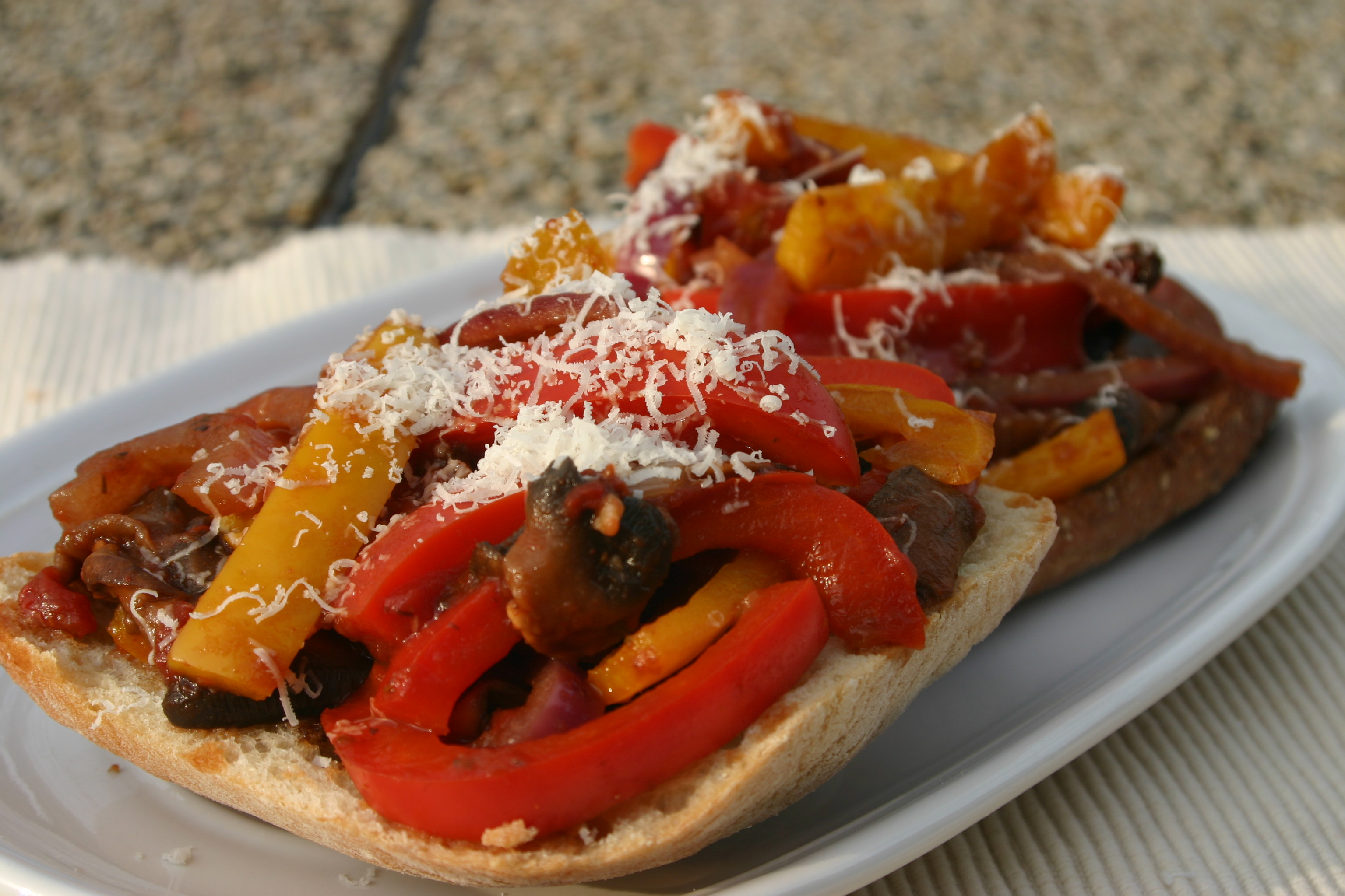 chopped yellow peppers, red peppers, a red onion and Portobello mushrooms. We also chose a petite harvest grain loaf and a petite ciabatta square, but any fresh artisan bread will work.