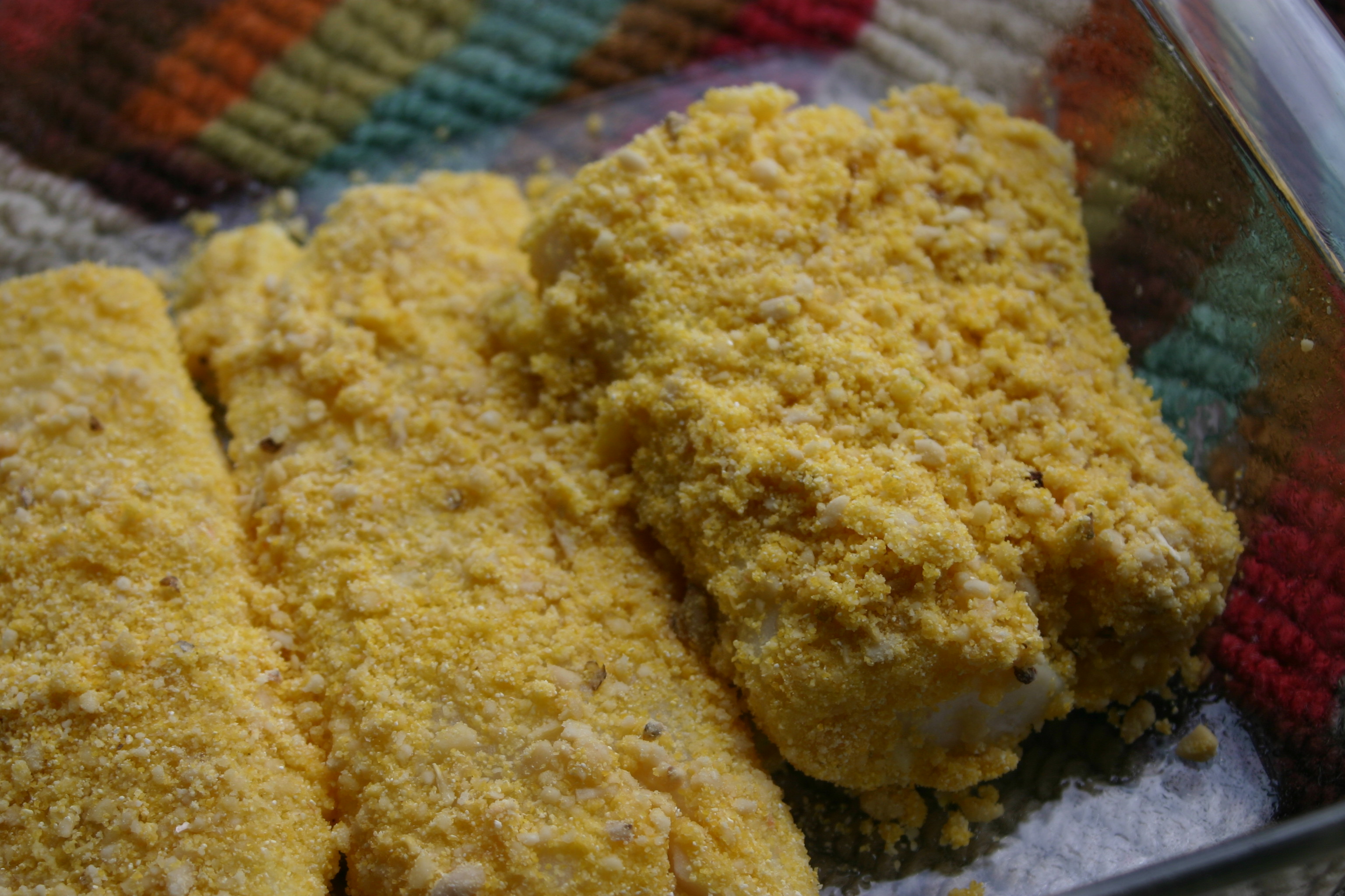 We then moved on to the fish. A trout would have been more true to Paiute cuisine, but we used a cod tonight. First we toasted a 1/4 c of pine nuts in the oven until golden brown. Then we ground another 1/2 c of pine nuts using the mallet (I got to wield the mallet tonight!) and combined it with corn meal, salt and pepper. We dipped the cod in whisked egg and coated with the nut/corn meal mixture.