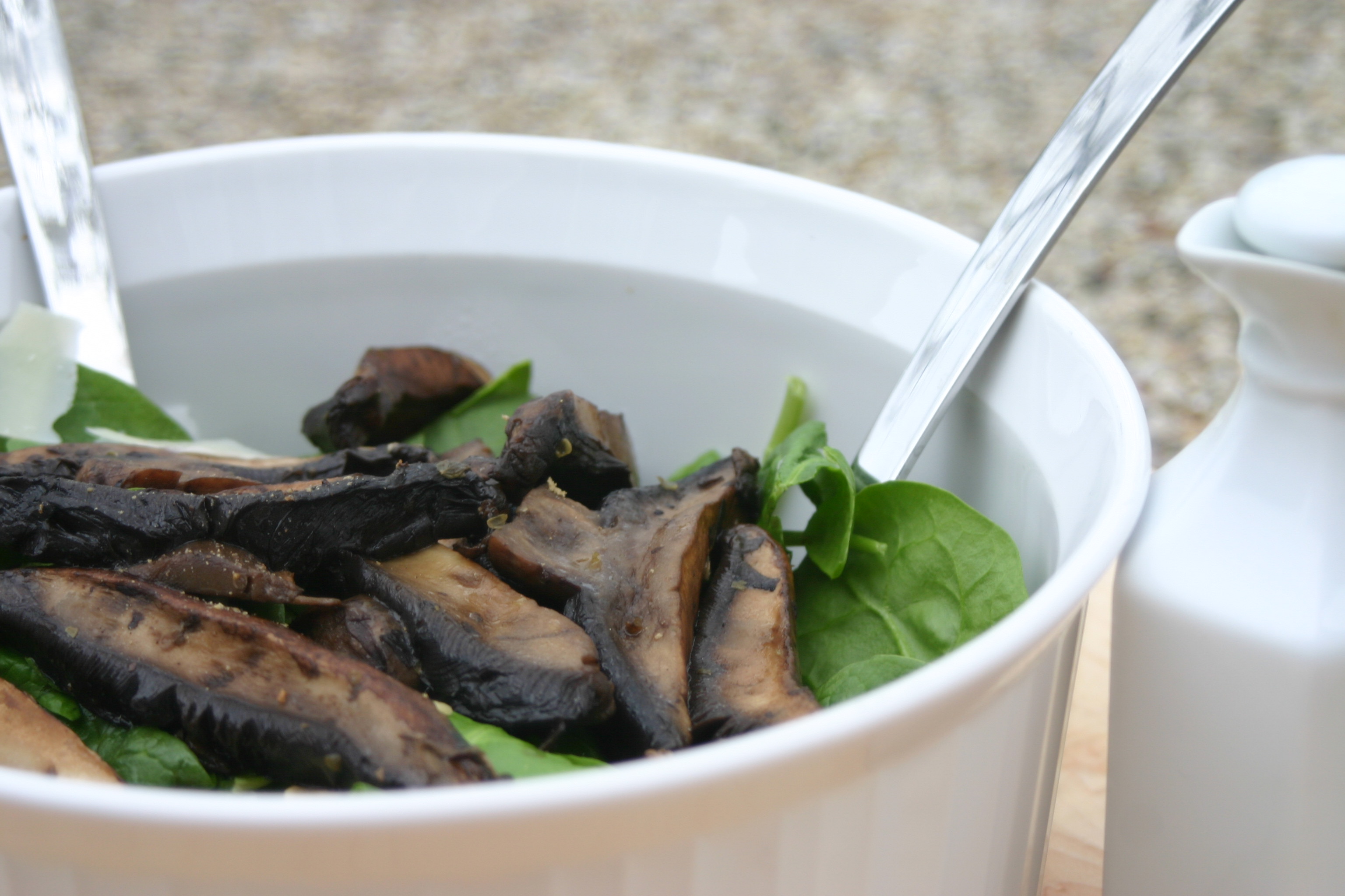 We then added the portabellos over the spinach, added some shaved parmesan and ground pepper. We served the salad with olive oil and balsamic vinegar. (Well, dad and I did. Mr. N and Miss A opted to leave the mushrooms out and used their own favorite dressings.) Voila! Salad is done.