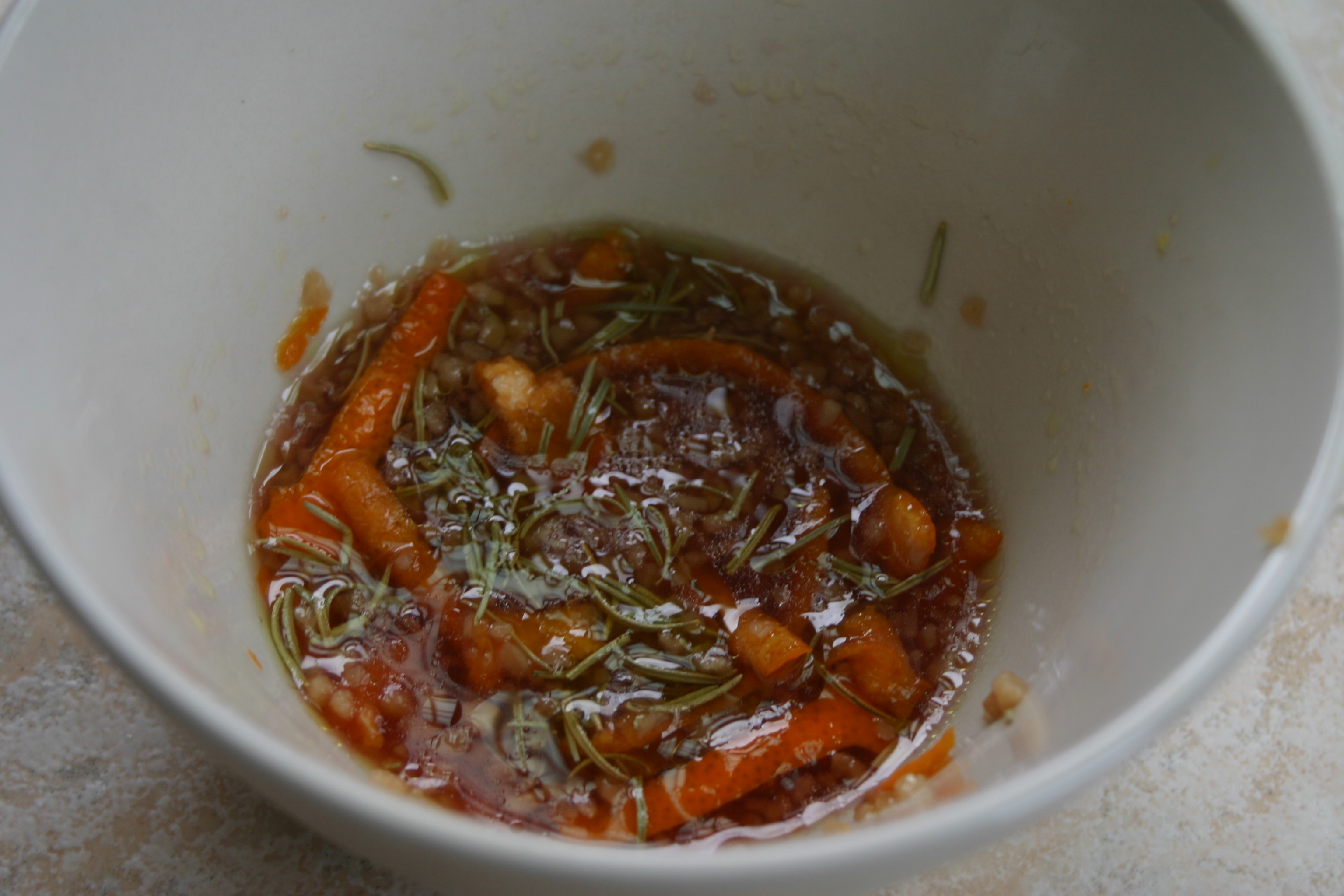 After melting a 1/2 cup of it in a skillet we poured it over the potatoes in a roasting pan. Next we mixed the potatoes so that they were all coated with the fat and placed them in the oven for 30 minutes (stirring once after 15 minutes). In the meantime we mixed together red wine vinegar, an orange peel, garlic and rosemary.