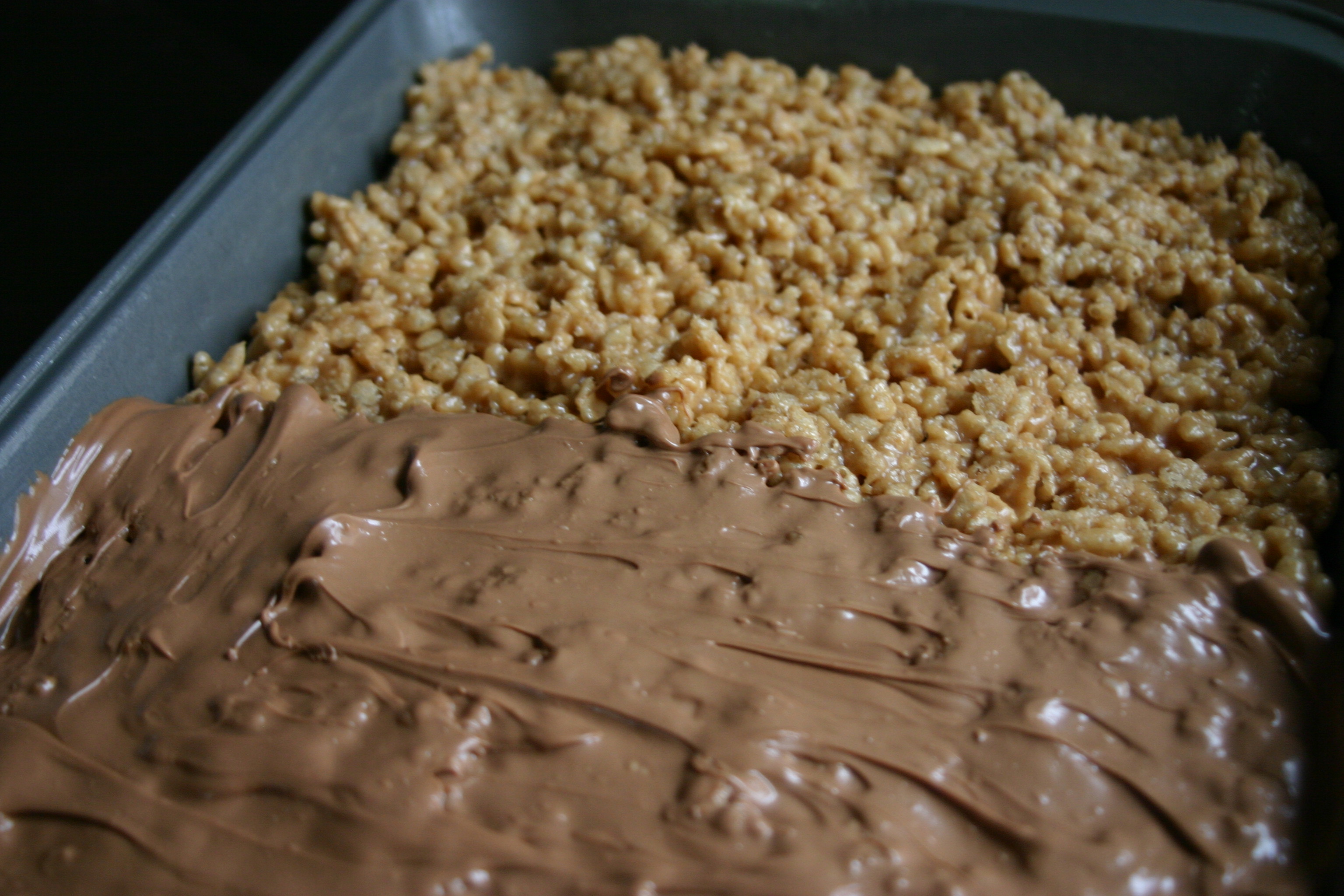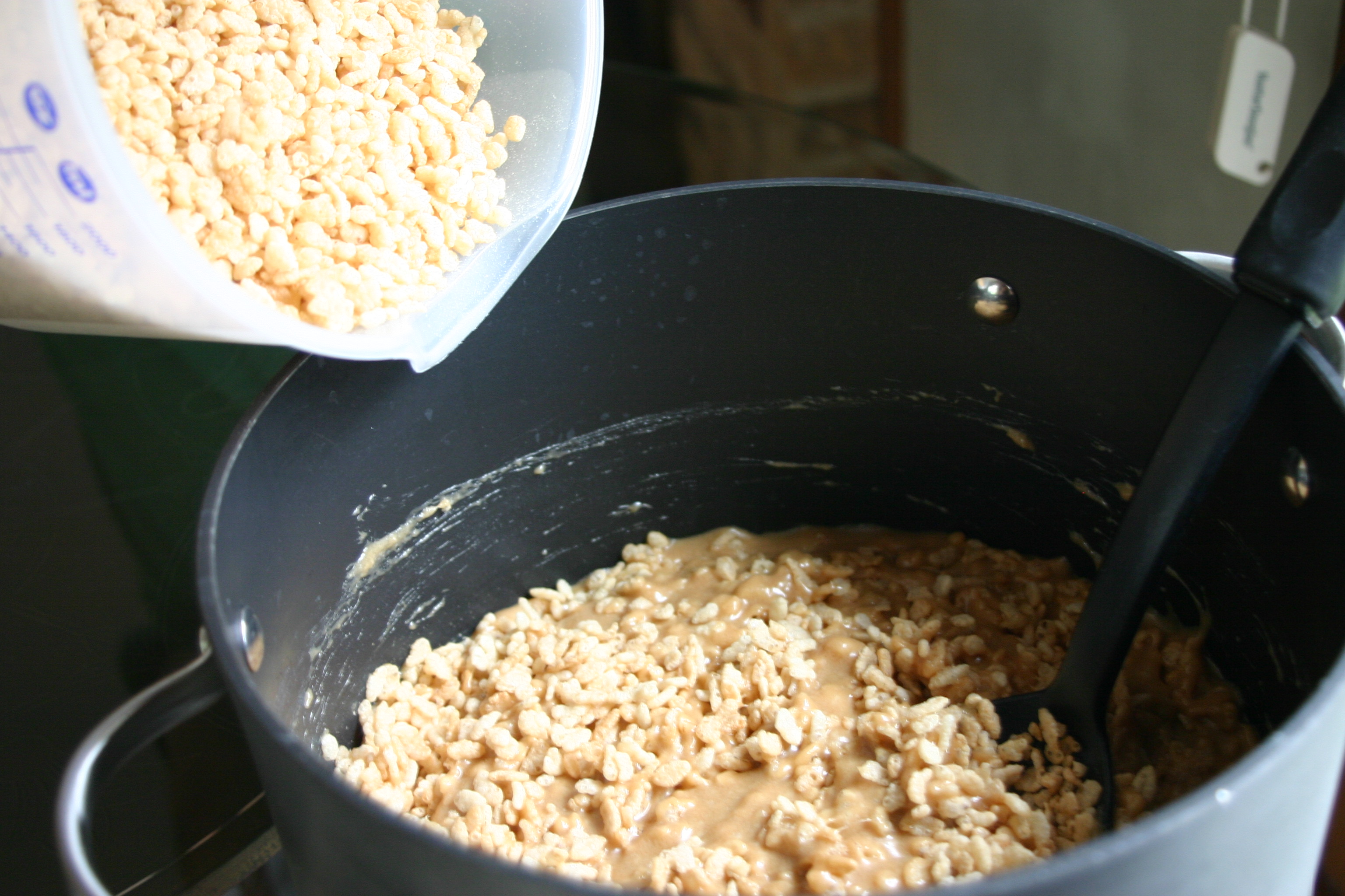 After the peanut butter was good and melted, we removed the pan from the heat and added six cups of Rice Krispies cereal to the mixture.