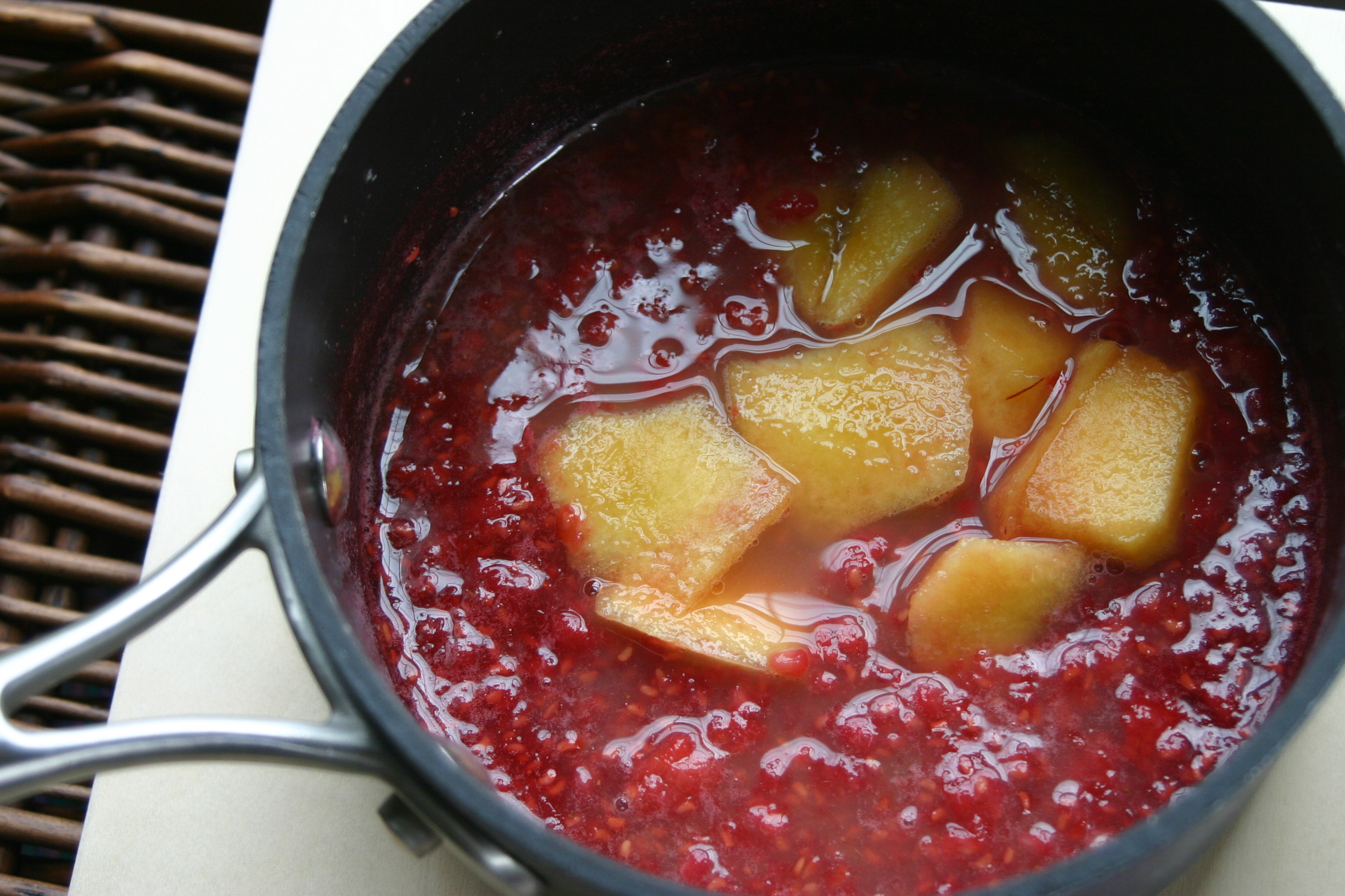 The recipe is easy – combine raspberries and sugar in a sauce pan and heat, stirring gently, until a syrup forms.