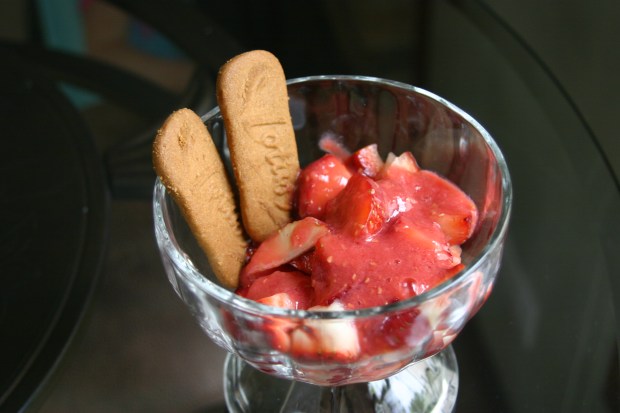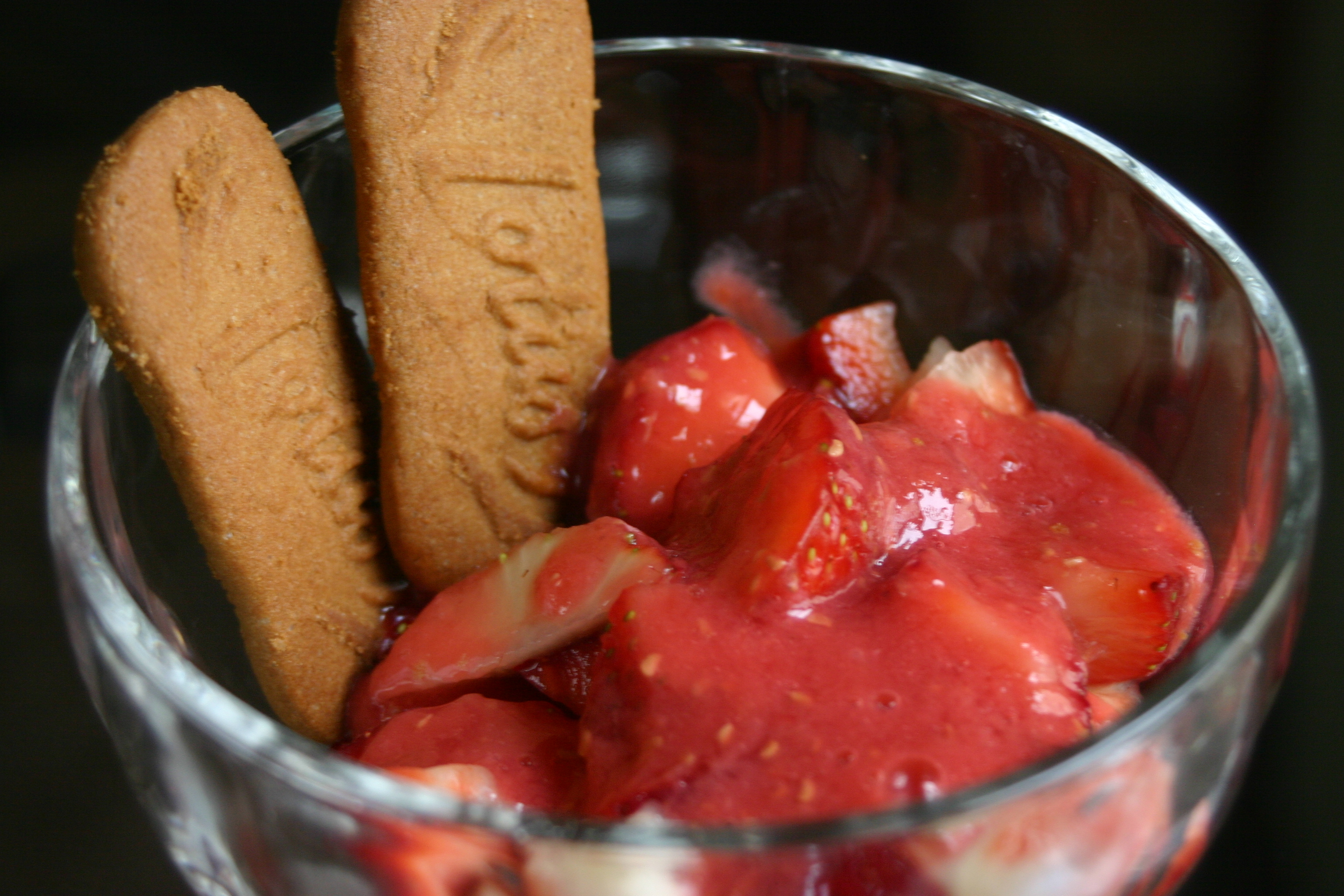 Lastly pour the raspberry puree over the strawberries and serve with finger biscuits.