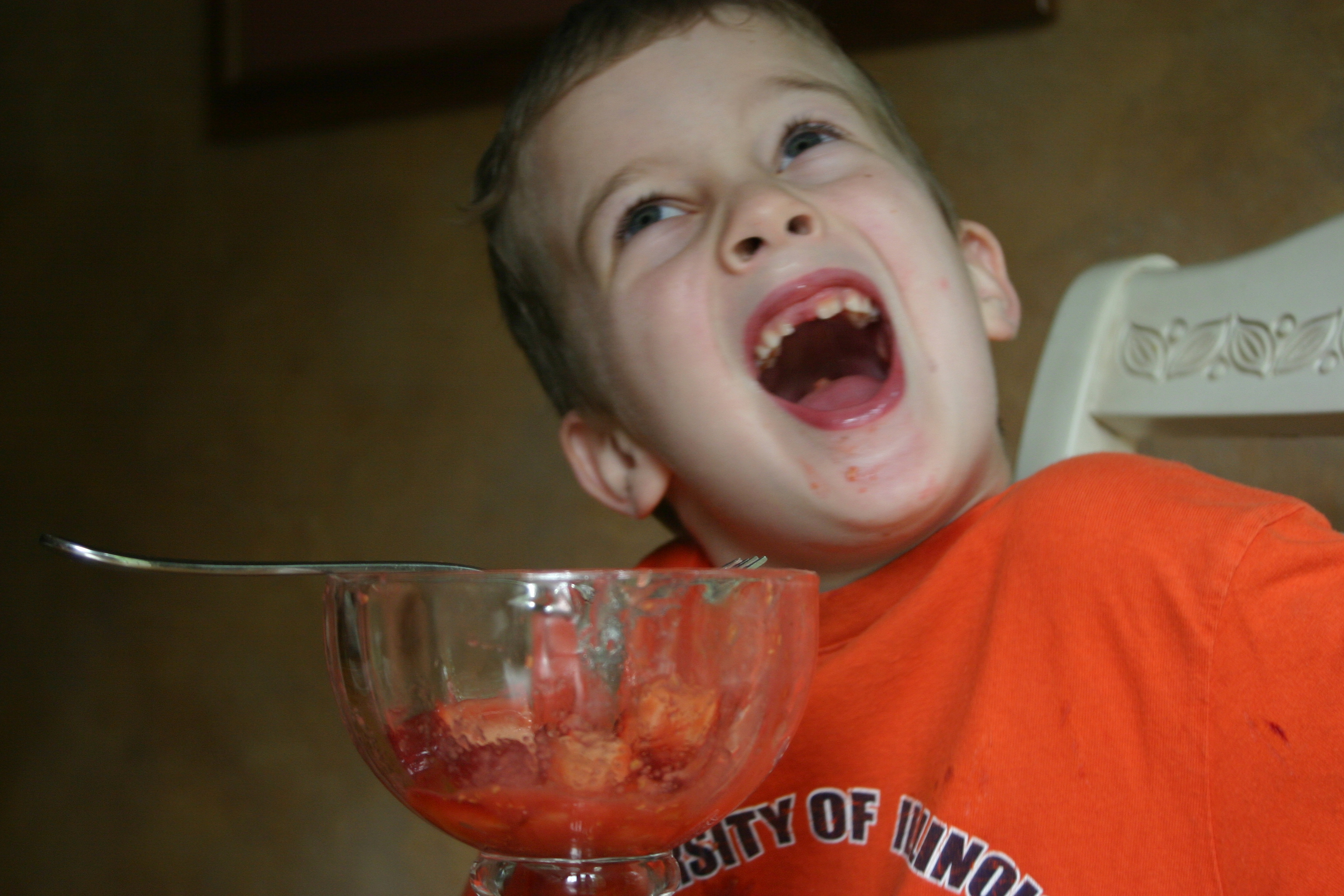 He’s our little ham for the camera – well actually they both are – but Mr. N probably more so. He knows how to work it. LOL. You could easily leave the peaches out of this one and get the same effect. Maybe even try papaya. 😉