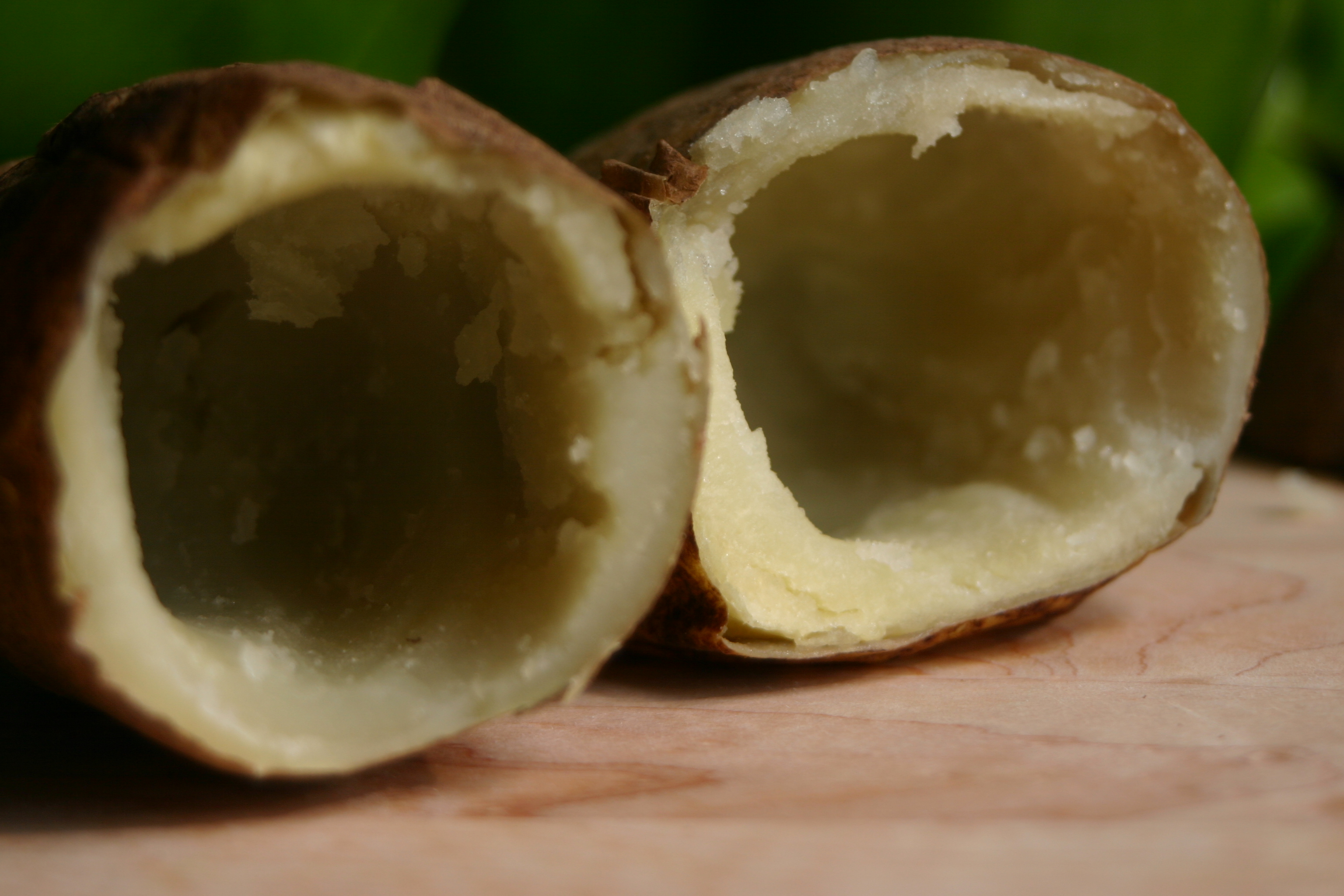 For our stuffing vegetables we chose potatoes for Miss A and Mr. N, and green peppers for me and dad. If you select potatoes you’ll need to bake them first – or if you’re running short on time like we were – use the baked potato setting on your microwave. Next stand the potatoes on end and cut the tops off. Scoop about half of the inside out of the potato.