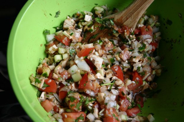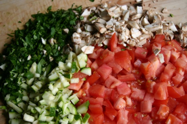 Now it’s time for the stuffing. We made two versions. For the adult version we used mushrooms, zucchini, tomato and cilantro.