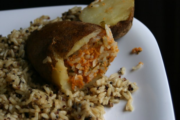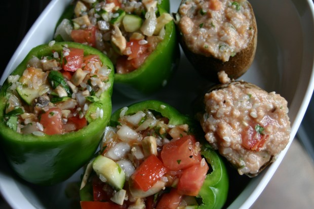 The potatoes weren’t bad, but I think I’d go back to my usual method of stuffing for the potatoes – they need more sauce and cheese. 🙂 The peppers were fantastic though. And for tonight’s meal we ate the leftovers on flat bread. Delicious!