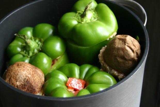 To bake we placed the veggies on end in a medium stock pot, replaced their caps and added water to cover the bottom of the pan.