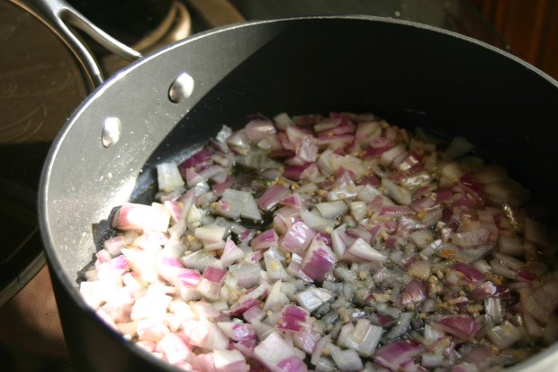 While the fish was marinating dad cooked the onion and garlic in olive oil.