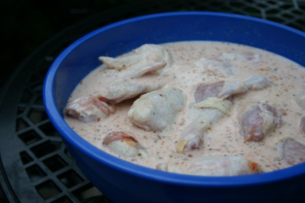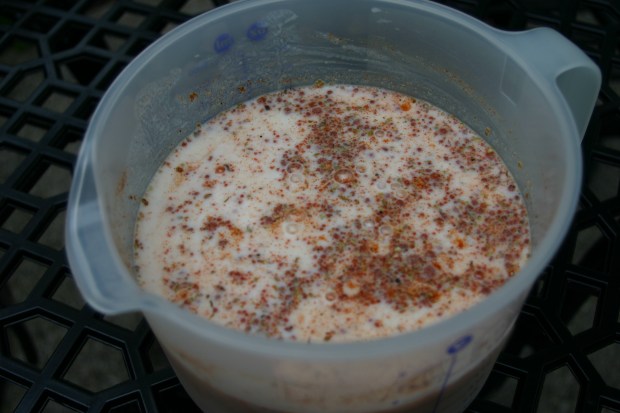 Next we made our dry rub with paprika, salt, garlic salt, pepper and oregano and added half of it to about six cups of buttermilk.
