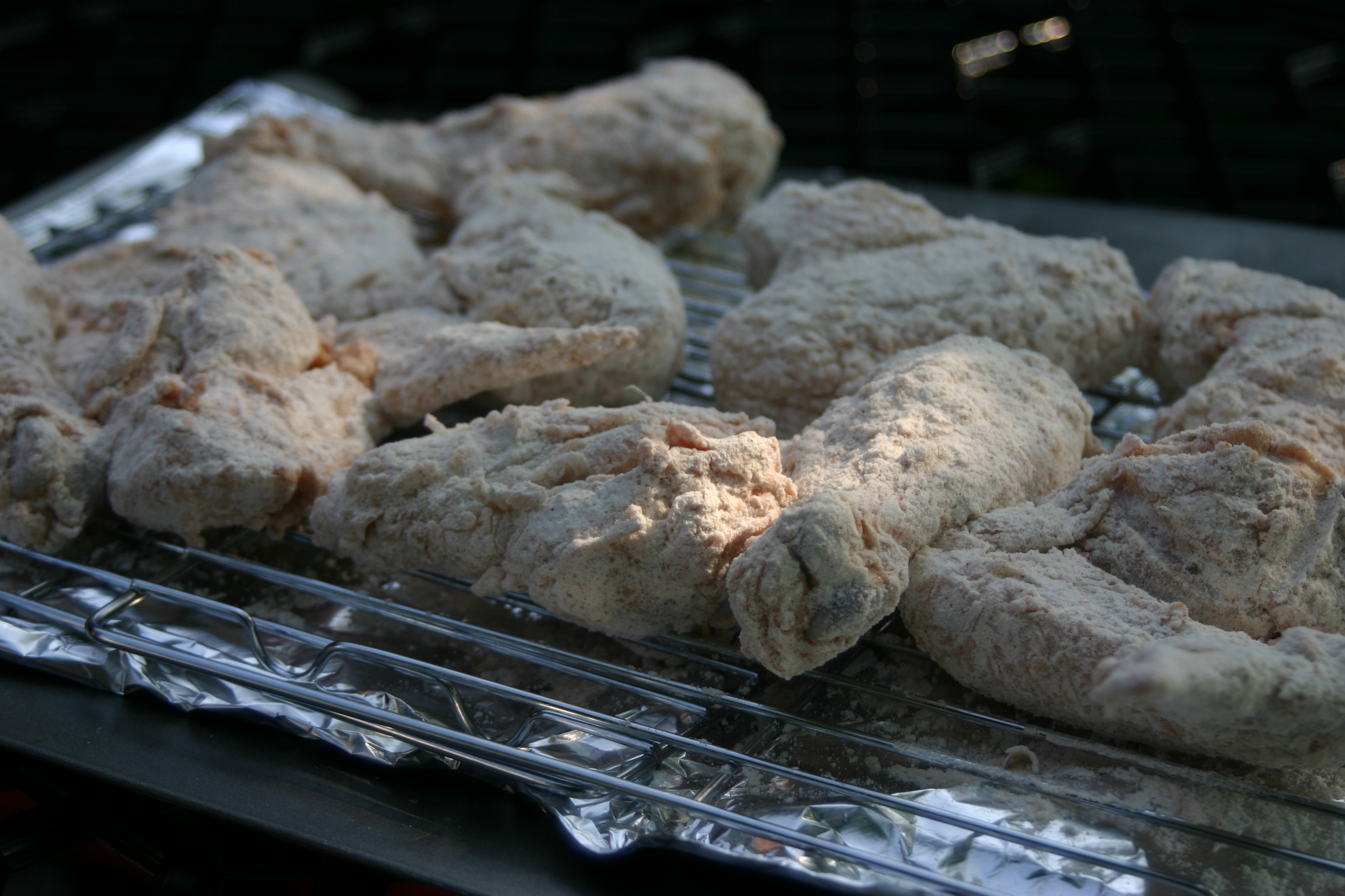 After some seriously intense shaking action, we set the coated chicken on wire racks to rest for about 20 minutes.