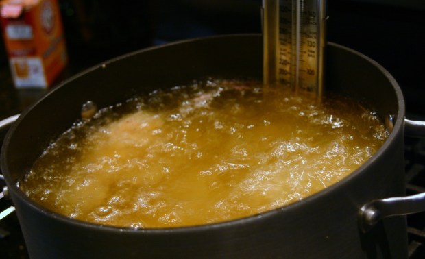 In the meantime, we added about 64 ounces of peanut oil to a large stock pot with a deep fry thermometer. (I’m so happy we invested in one of these little gadgets. Not only did it keep our chicken from blackening, but it kept my mind at ease with the oil. Okay – not at ease, but a bit less anxious.)