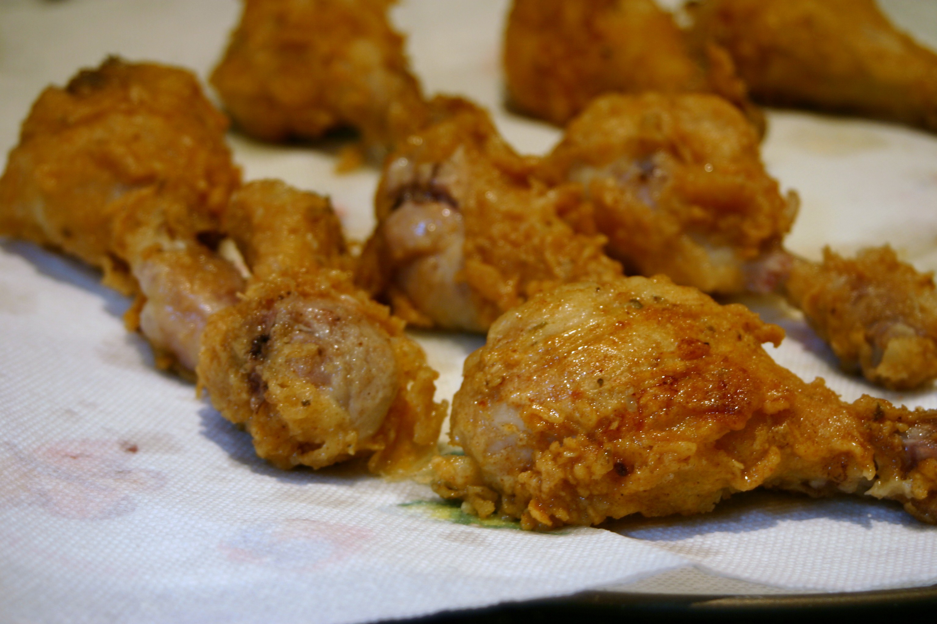 Once the oil reached 300F we added the chicken legs and fried them for about 20 minutes. When they were done we removed them from the oil and set them to drain on paper towels while we added the wings to the pot.