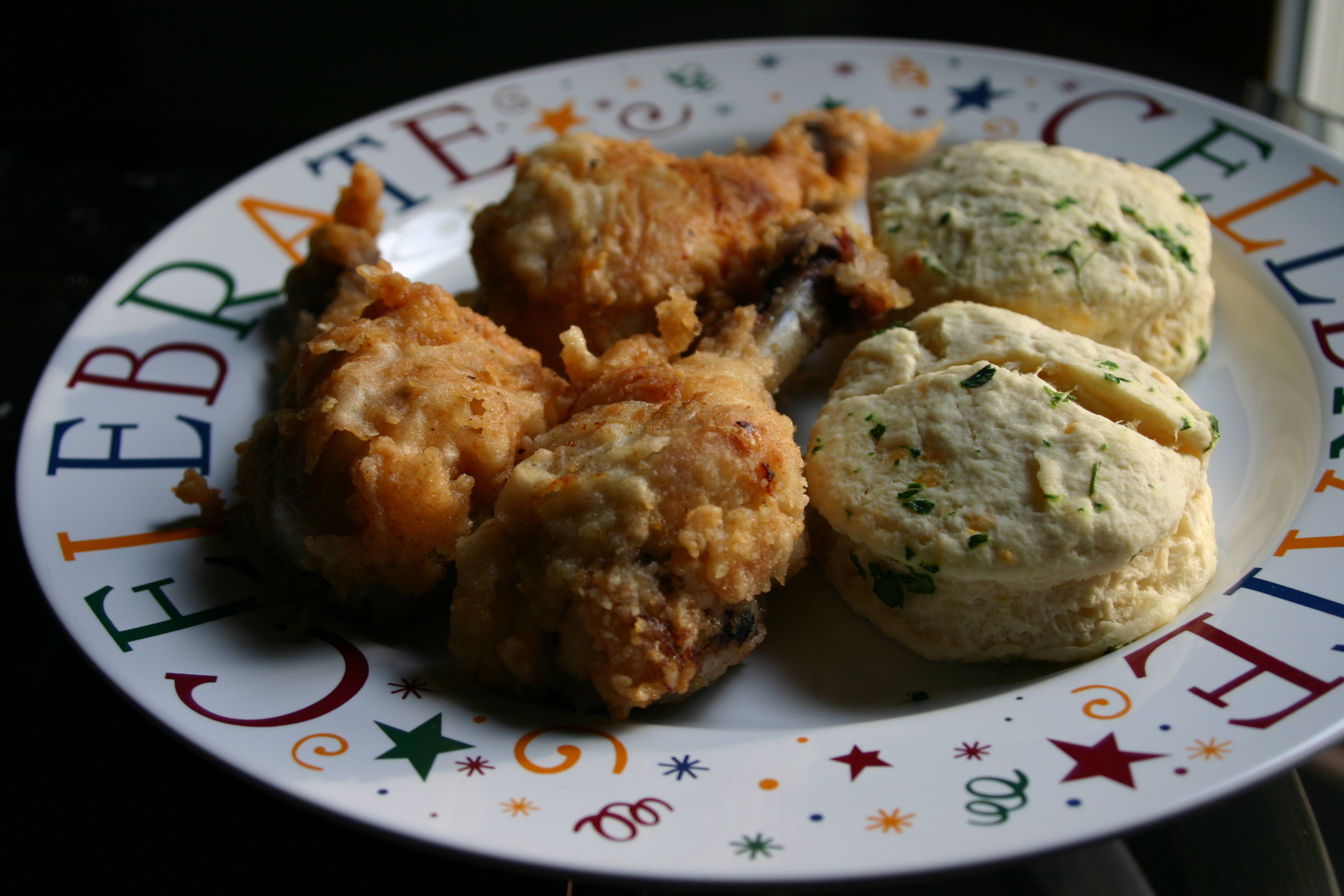 In total it took about 40 minutes to fry up all the chicken. We had about two dozen chicken pieces that were juicy and fried to perfection. We served our buttermilk fried chicken with some cheddar garlic biscuits and of course the cobbler. You’ll note the absence of vegetables – it was Mr. N’s birthday after all! 😉