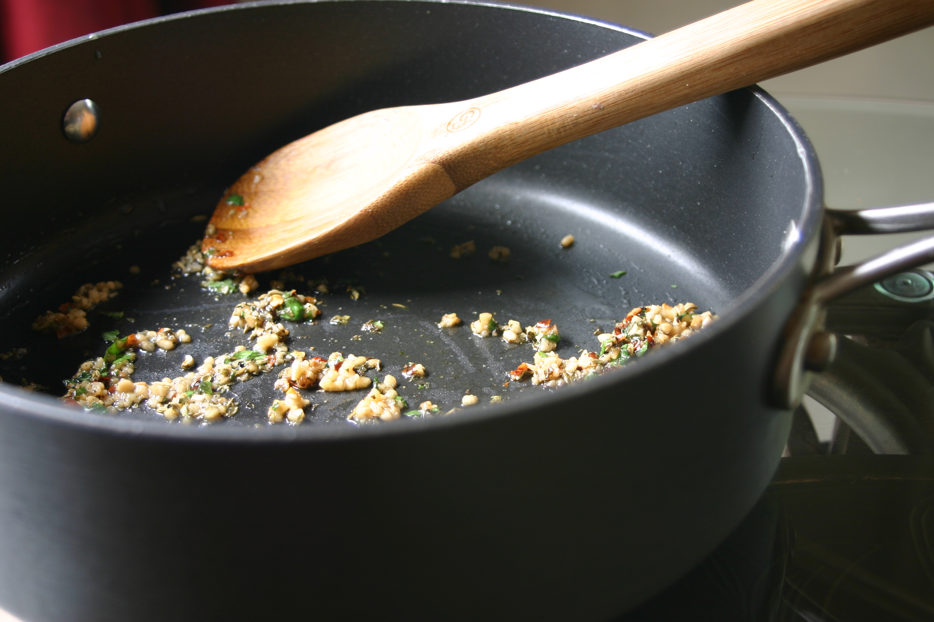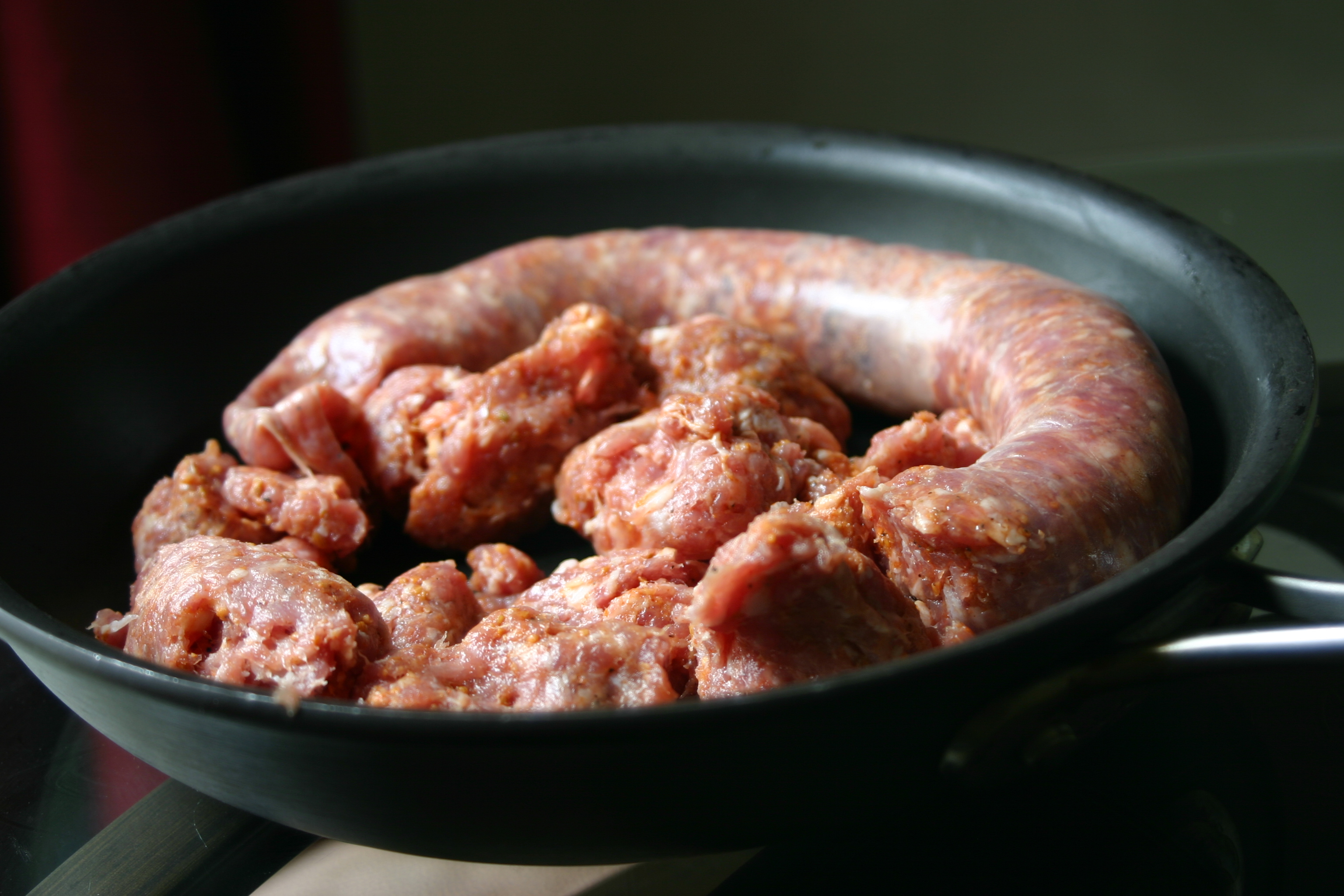 We picked up some mild Italian sausage from the local Italian market and crumbled about a pound’s worth into a skillet.