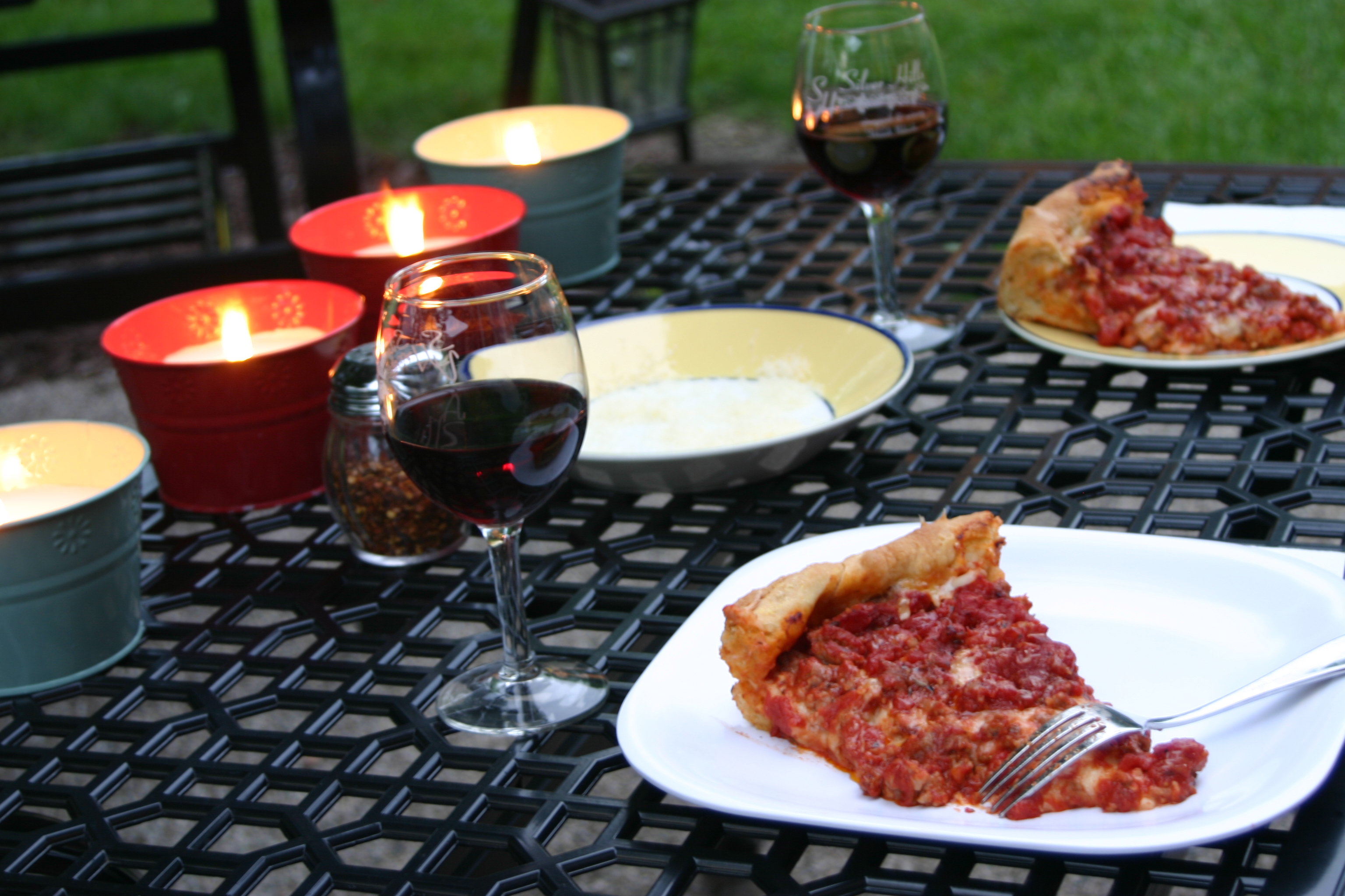 Looks so good – bet it was really nice to enjoy outside with a nice glass of wine. I have a question though, being not overly familiar with traditional Chicago pizzas… Cheese on the bottom and the sauce on top? 😮
