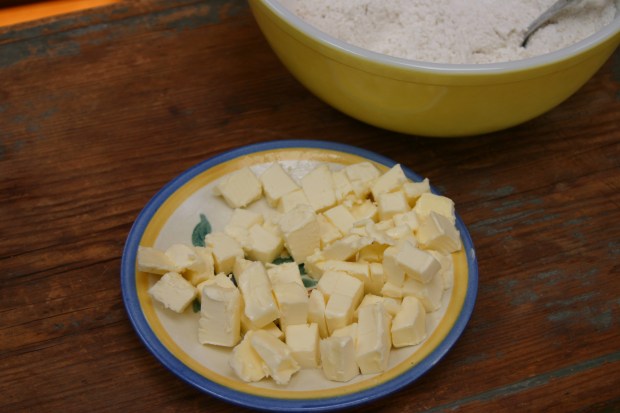 Next I used two knives in a scissor fashion to cut the butter into the dry ingredients. A pastry blender would also work well.