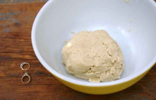 Once I had small and large crumbs forming, I decided to take off my rings and dig-in. Using my hands I kneaded and mashed and formed the shortbread dough.
