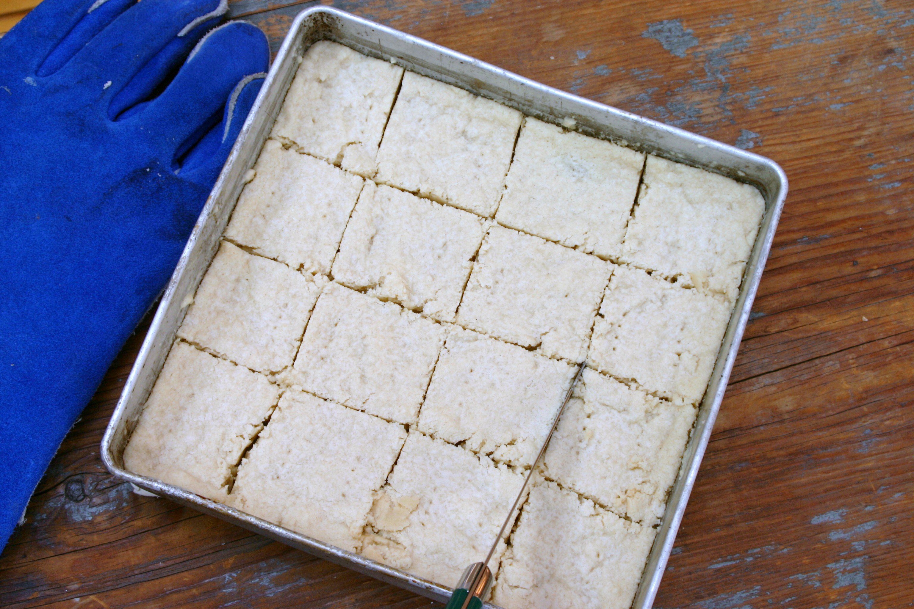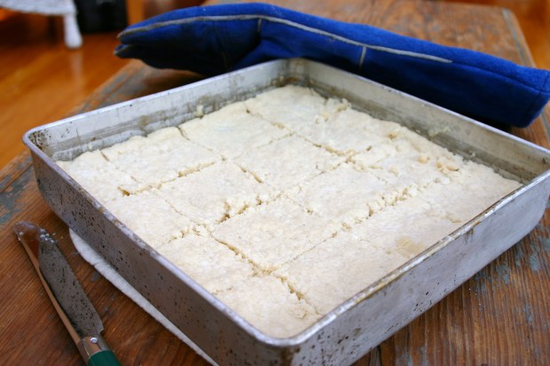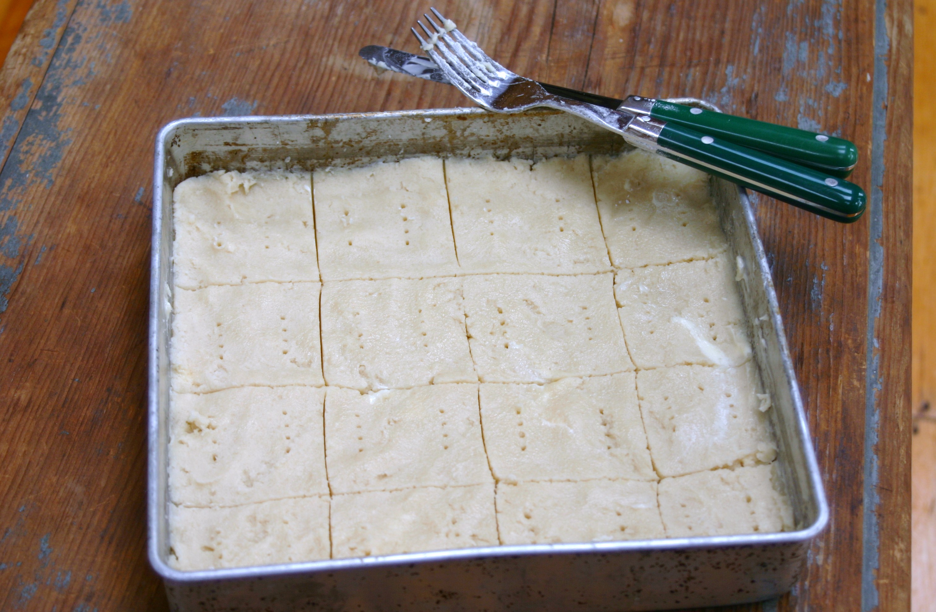 Next I greased an 8-inch square pan and pressed out the dough as smoothly as possible. I then scored the dough with a knife creating 2-inch squares and using a fork made two sets of holes in each square.