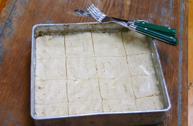 Once out of the oven, I followed the cookbook’s recommendation to re-cut the score lines immediately. It’s supposed to prevent the shortbread from crumbling as it’s likely to do if you cut it after it cools. I found that it still crumbled fairly easily, so I would just recommend cutting it carefully.
