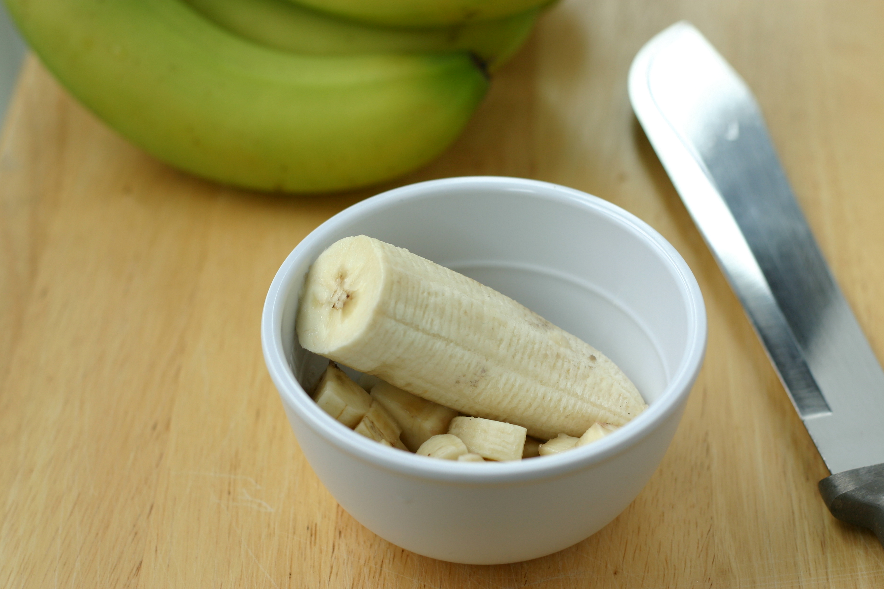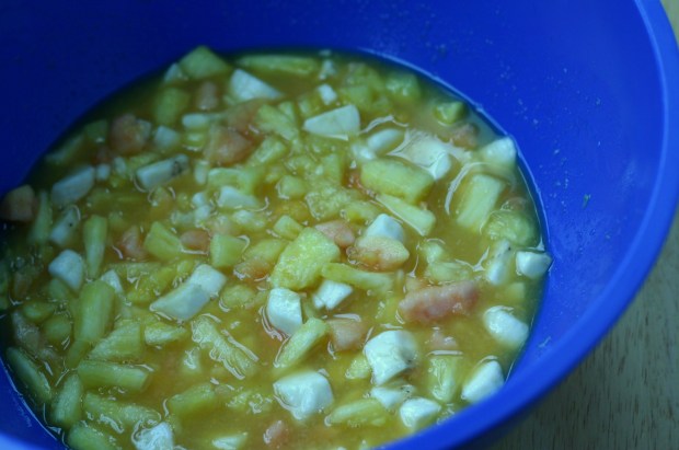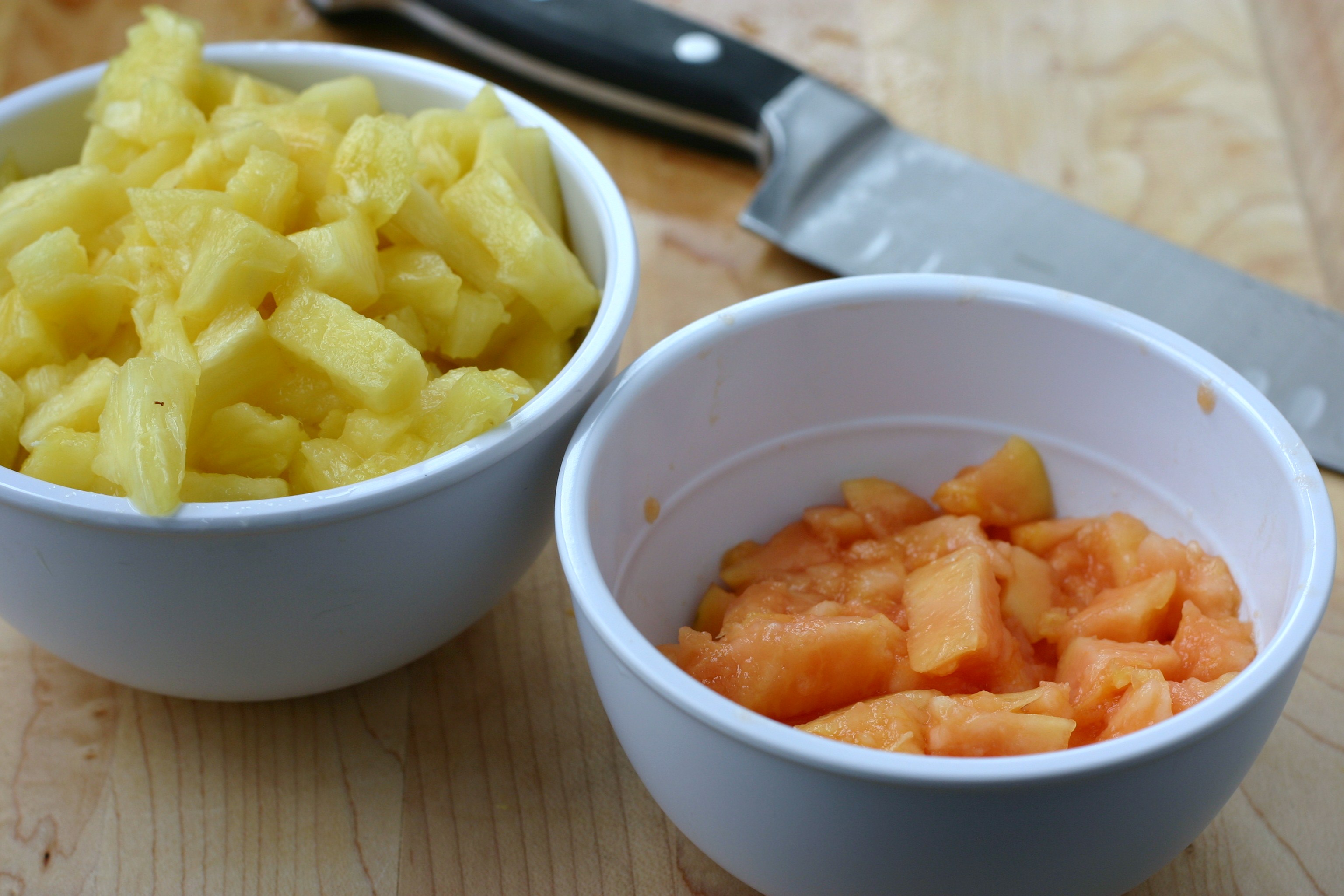 It’s very simple to prepare and can be done in advance. Although if you’re making it ahead of time, make sure to reserve chopping and adding the bananas until it nears serving time to avoid discoloration. We started our come y bebe by peeling, seeding and chopping a papaya.
