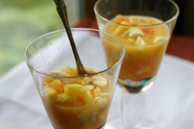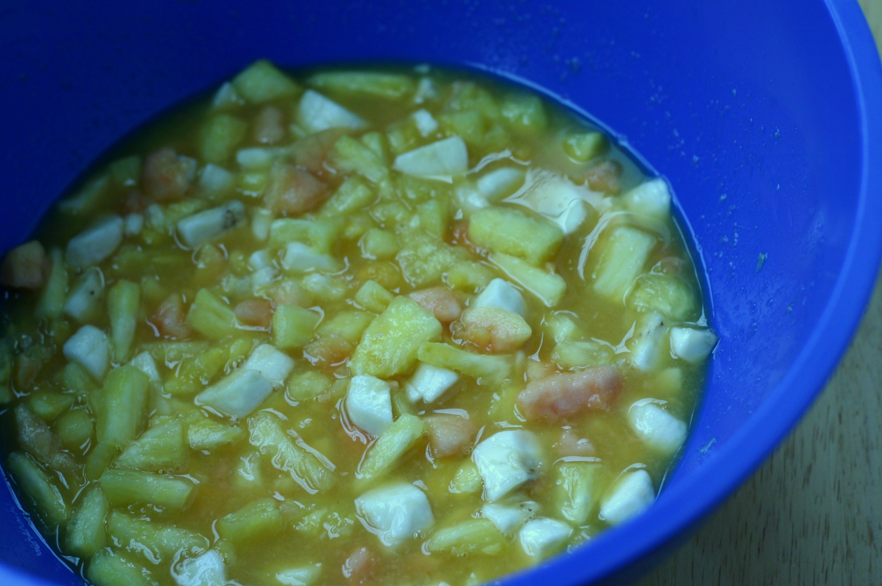 In addition to our bean stew on Sunday, we also made a wonderful fruit dish. This recipe is again adapted from Laylita’s Recipes and would be wonderful on a hot summer day. We also thought it would be a great complement to our hearty and spicy beans. (Translation – just in case I hated the beans, I needed something to fall back on!)