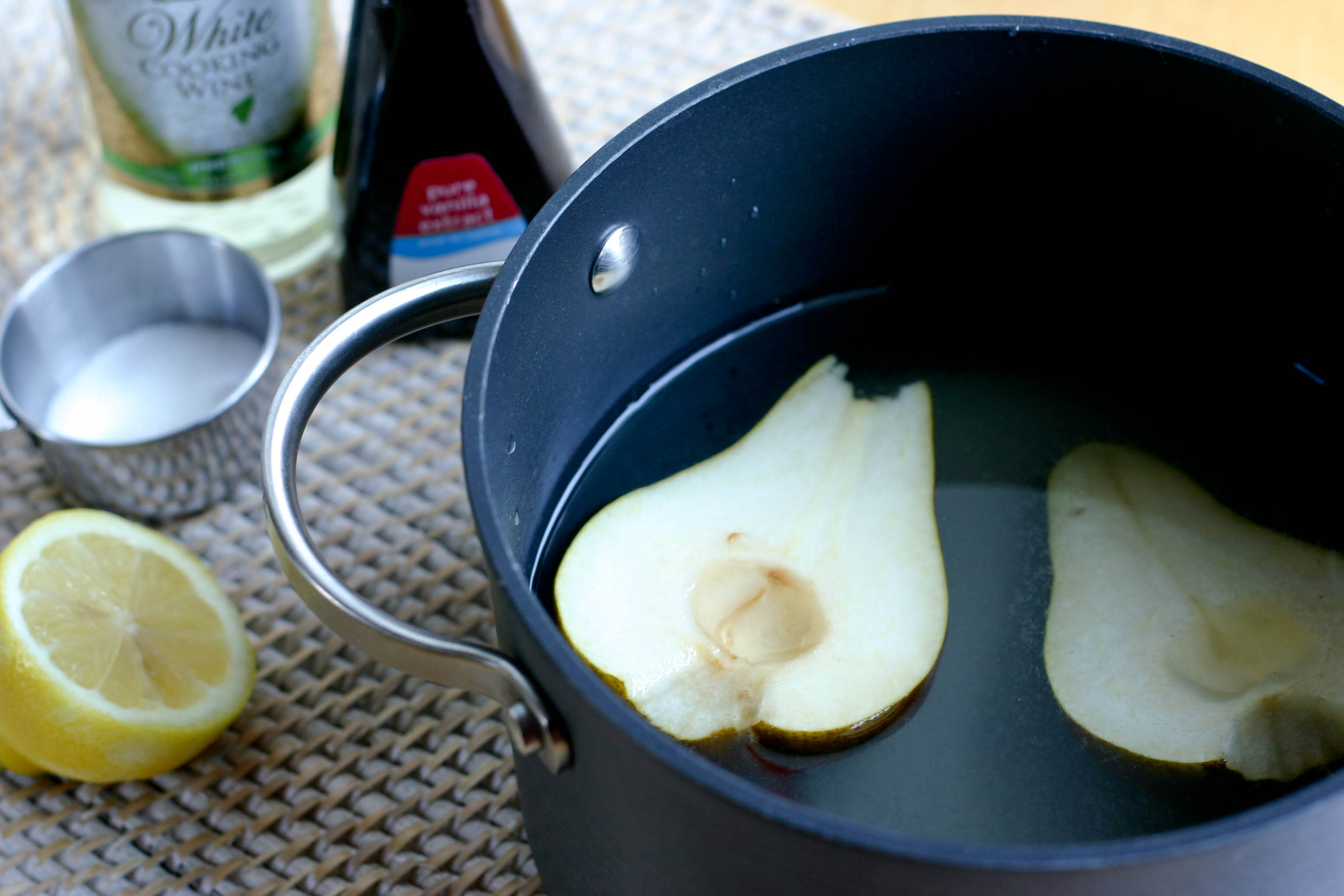 Next it’s time to poach the pears. We used a combination of water, white wine, vanilla, lemon juice and sugar for our pears. We first dissolved the sugar before adding the pears to the liquid.