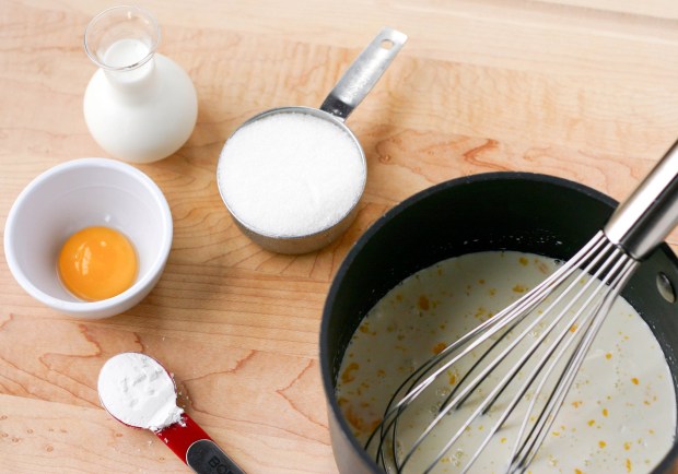 We started by whisking together a few egg yolks, corn starch, sugar and half & half in a saucepan over medium heat. Many of the recipes called for using either all milk (skim, whole, 2 percent), or a combination of heavy cream and milk. I know some of the professional chefs out there are cringing, but we went for the fat-free half & half just to be a little healthier.