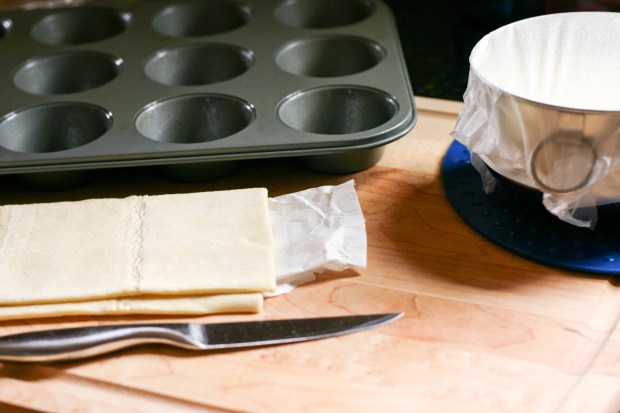 As the custard sat aside, covered in plastic wrap to keep it from forming a skim, we turned our attention to the pastry. First we preheated the oven to 375F and greased a 12-hole muffin tin. Now, many of you know how much I love to make pie and pastry crusts, but for this recipe we went the simple route and used store-bought puff pastry. I’d never tried it before and was kind of curious about it. We used one sheet and sliced it in half. We then placed one half on top of the other.