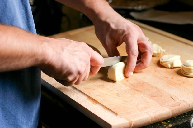 Next we rolled the pastry into a log, beginning from the short end of the pastry stack. Once rolled, Mike sliced the pastry log into 12 half-inch pieces.