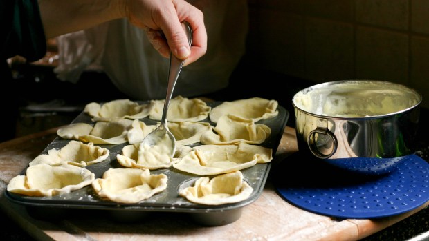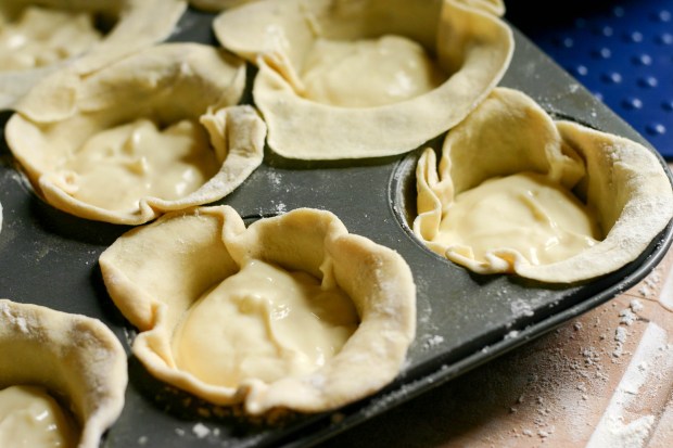 We tucked the circles into the muffin tin and began spooning the cooled custard into each tart.
