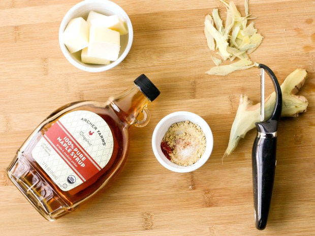 My friend Beth shared this recipe with us many years ago and we still make them at the holidays today. We started by gathering our ingredients: butter, maple syrup, fresh ginger, ground ginger, salt and cayenne pepper.