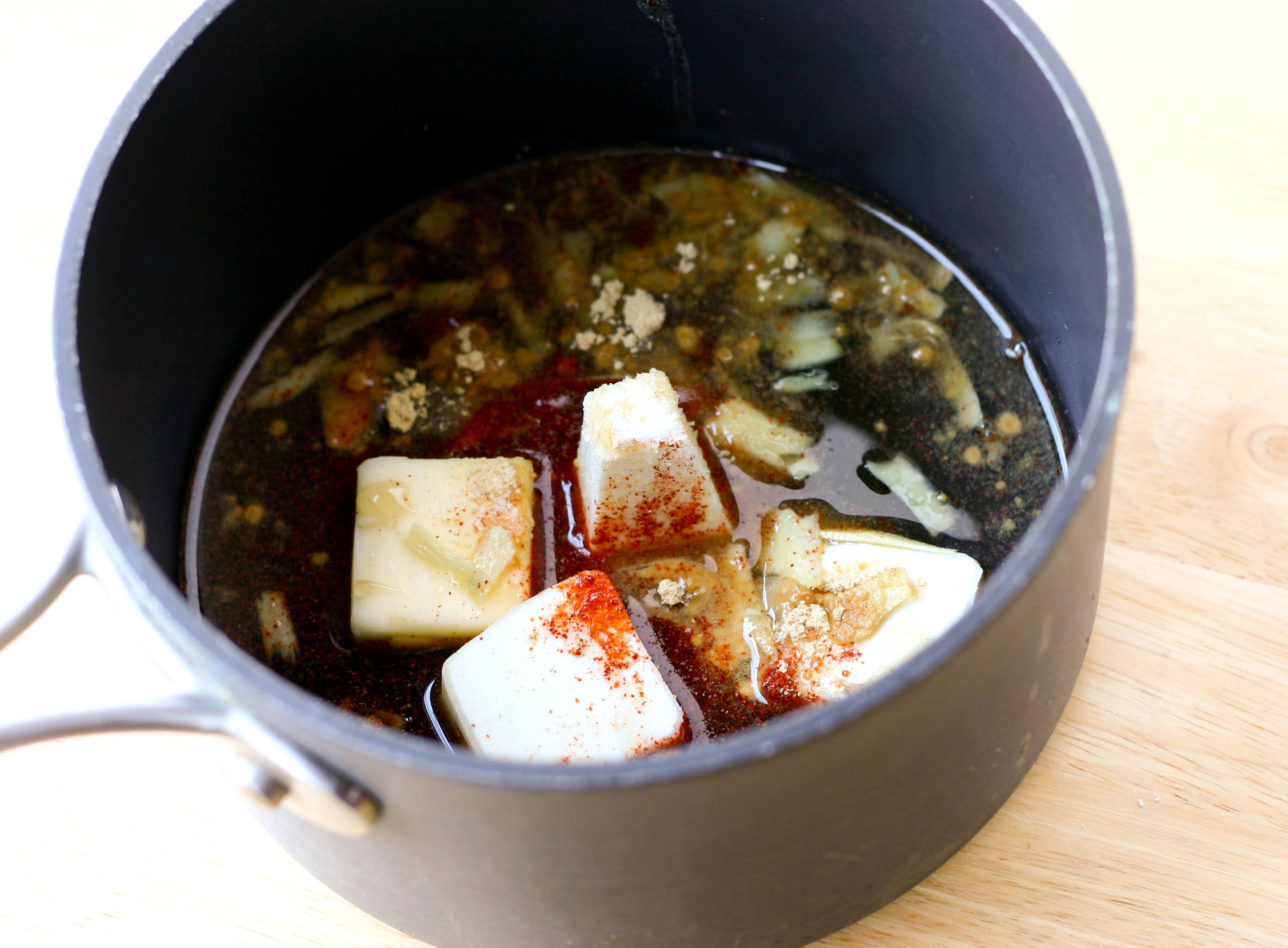 Next we combined all the ingredients in a small sauce pan with a tablespoon of water and melted the butter over low heat.