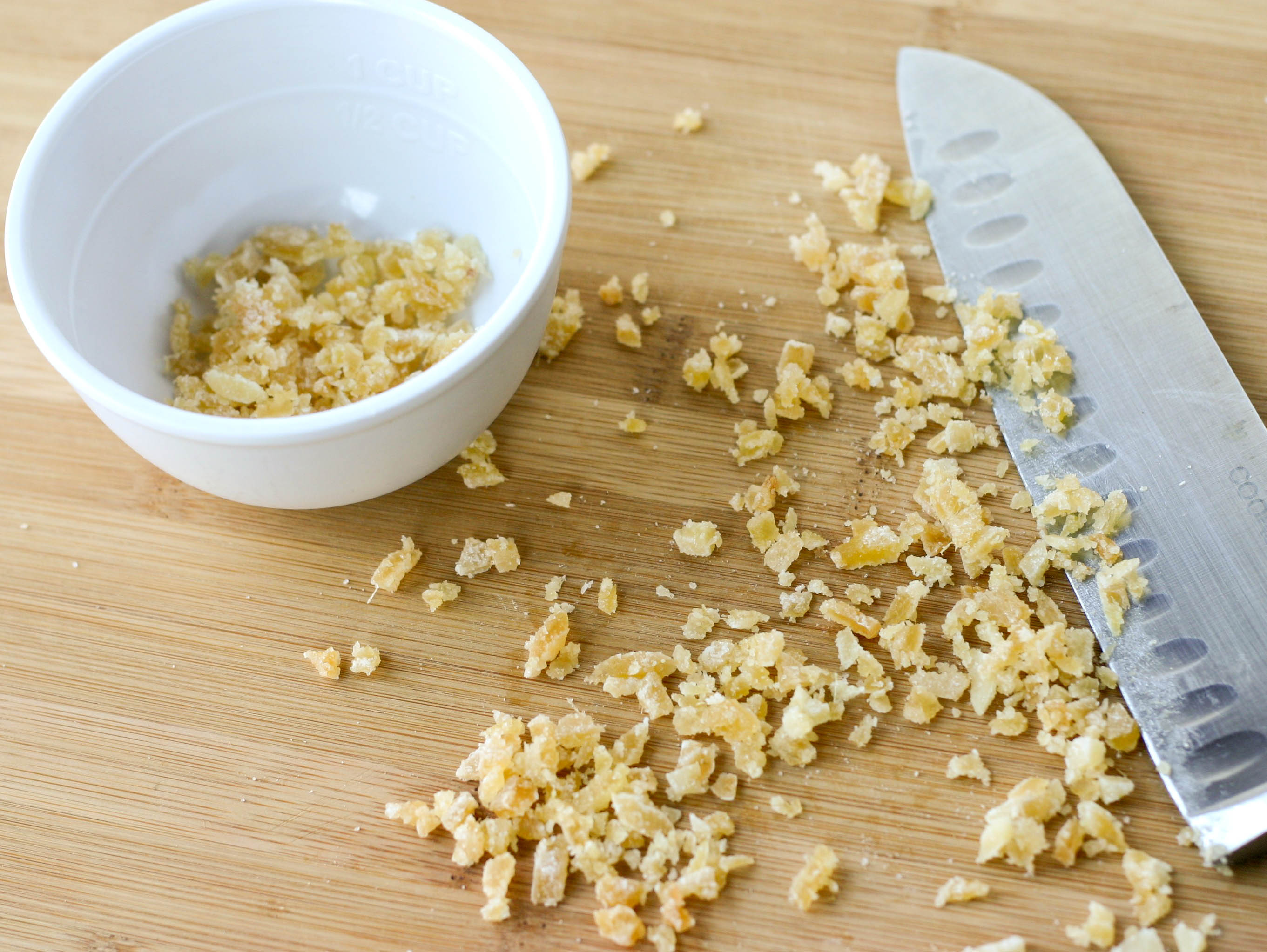 Now while it’s extremely tempting to pop a few in your mouth right of the oven – resist the urge. The sugar glaze is HOT. So while the walnuts cooled, we minced up some crystallized ginger. Mr. N is a big fan. At our cooking class a few weeks ago he ate nearly a bowl of the stuff (he was the only kid in class to like it too!).