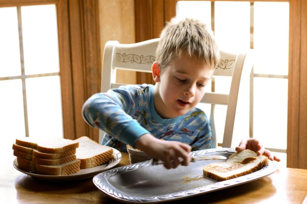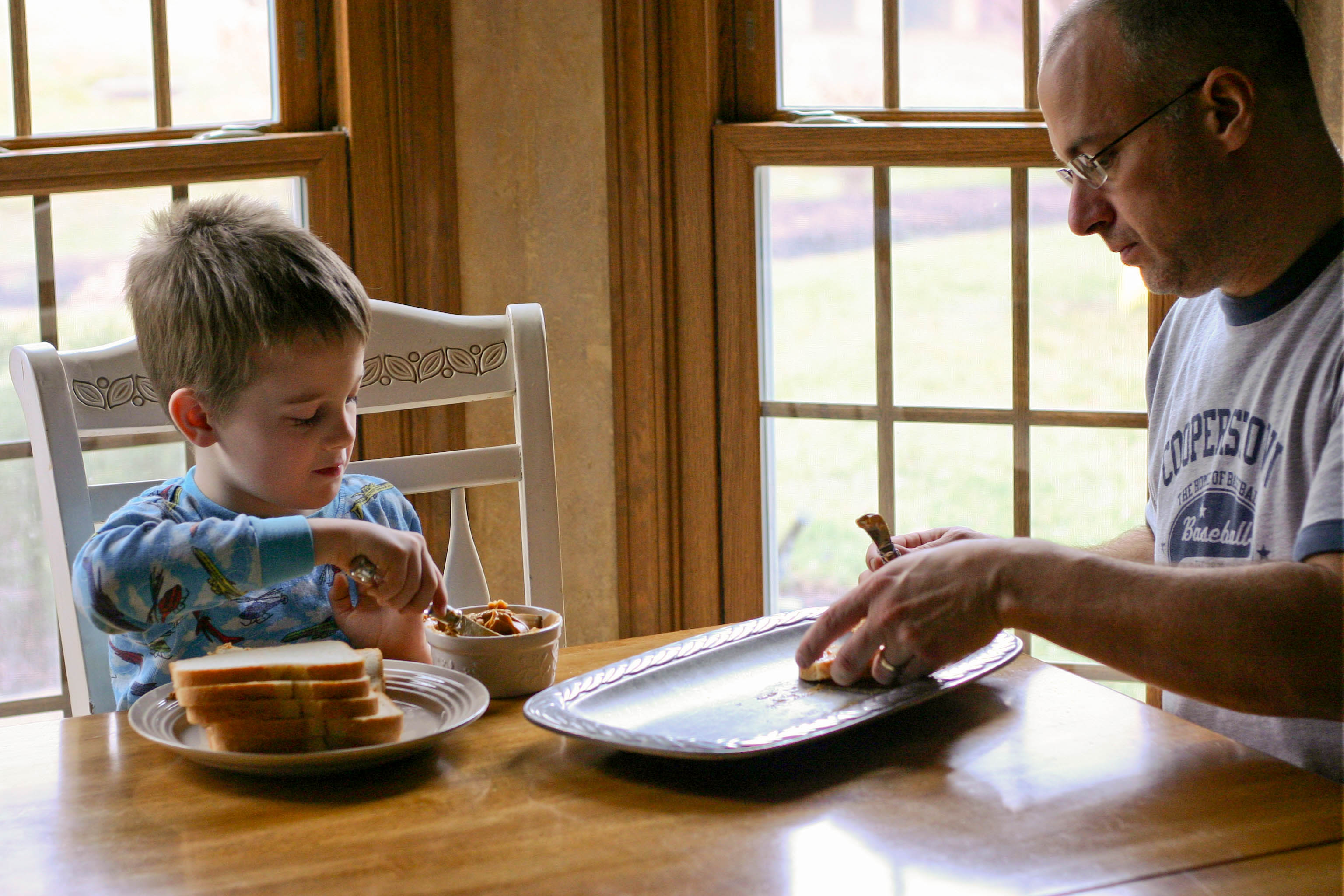 Then it was my job to try to manage the peanut buttered bread without getting the slices stuck together.