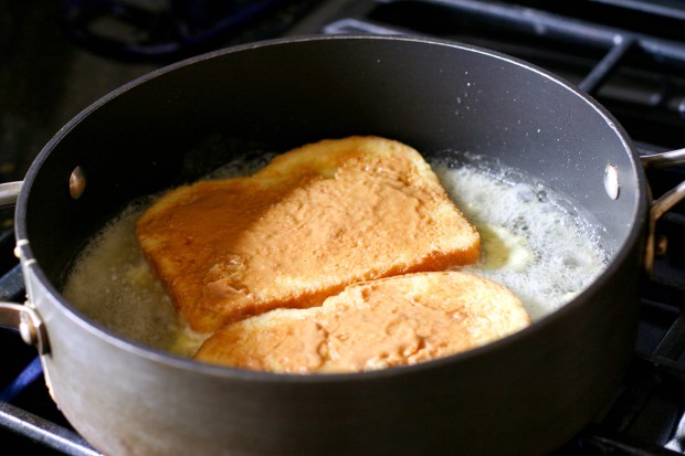 After that, we coated the peanut butter-covered slices in the egg and tossed them in a whole lot of butter. We used enough butter to fill about a quarter-inch of the pan, so it’s almost like deep-frying rather than just coating the pan to prevent sticking.