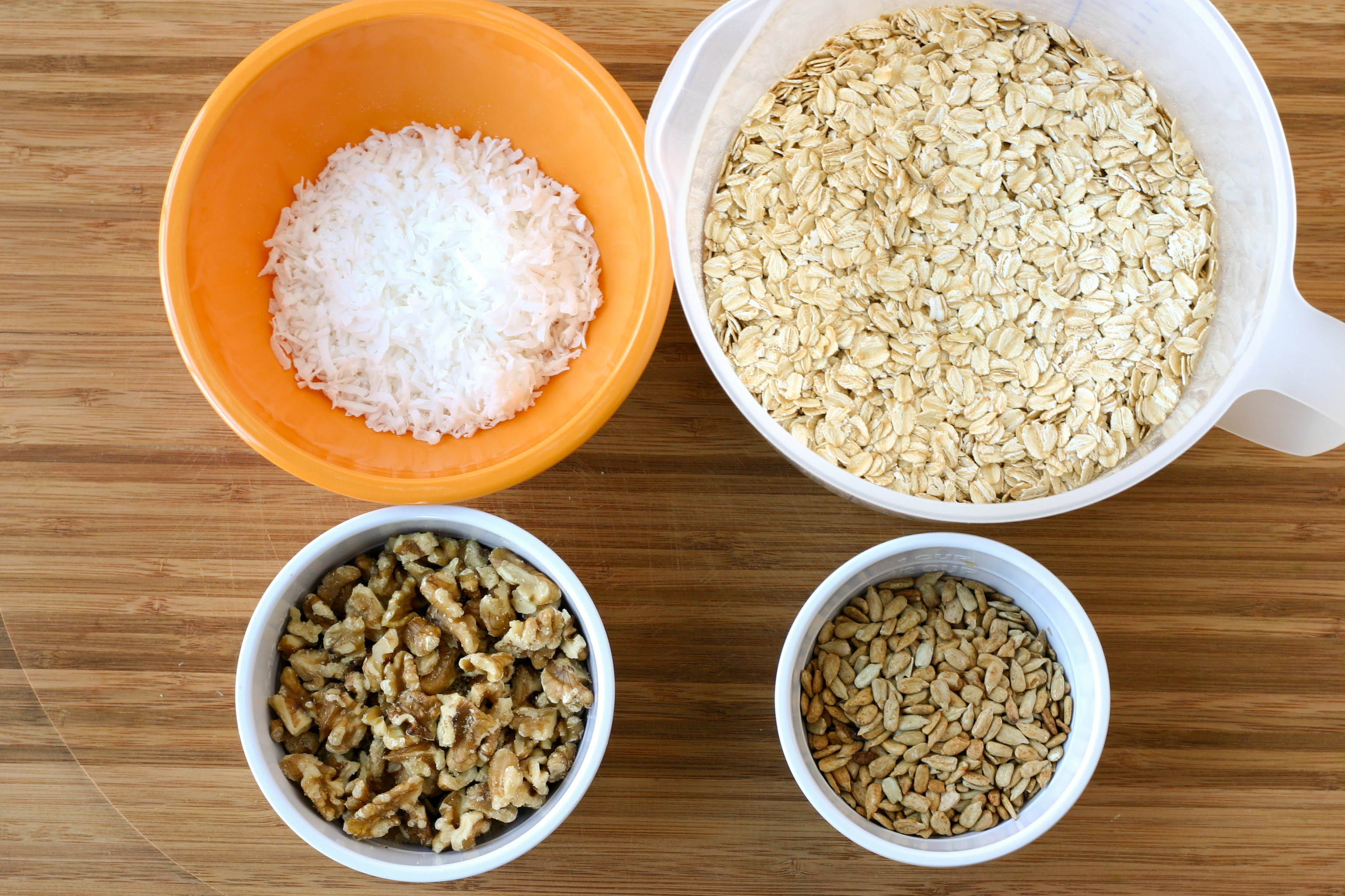We first gathered the sweetened coconut (We would have preferred unsweetened, but this is all we could find at the store.), whole grain organic oats, chopped walnuts and sesame seeds.