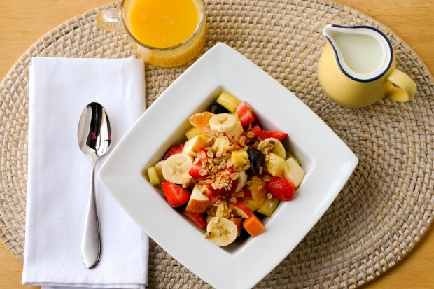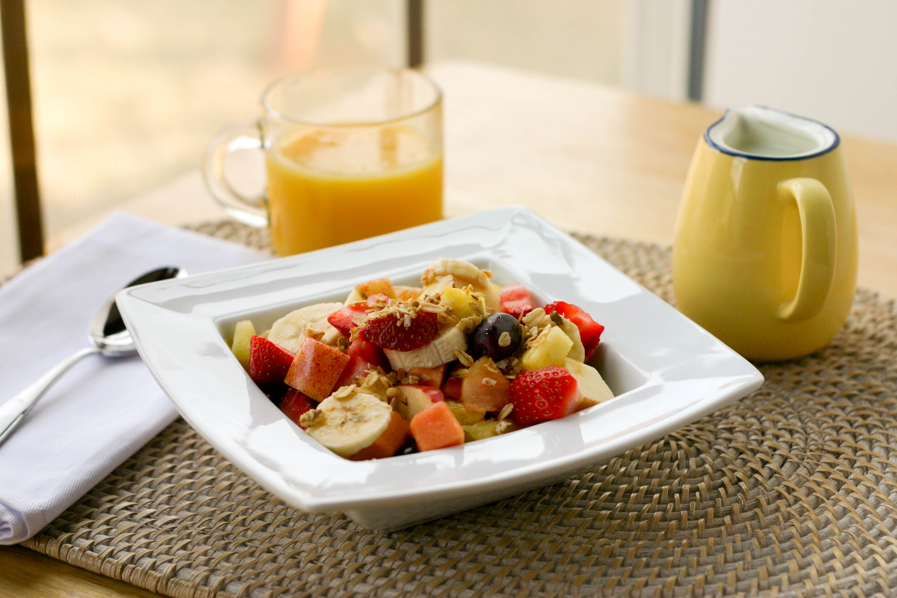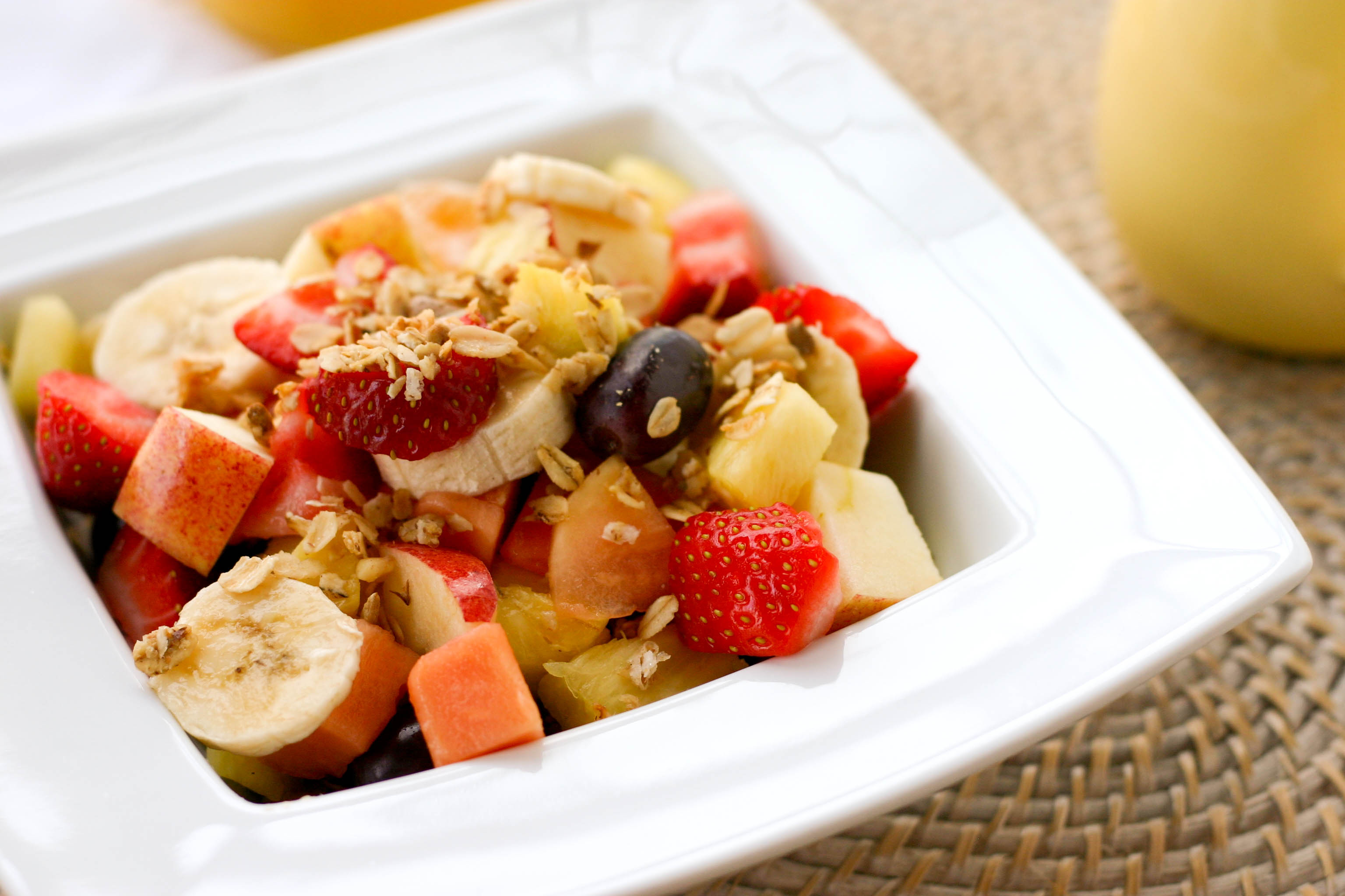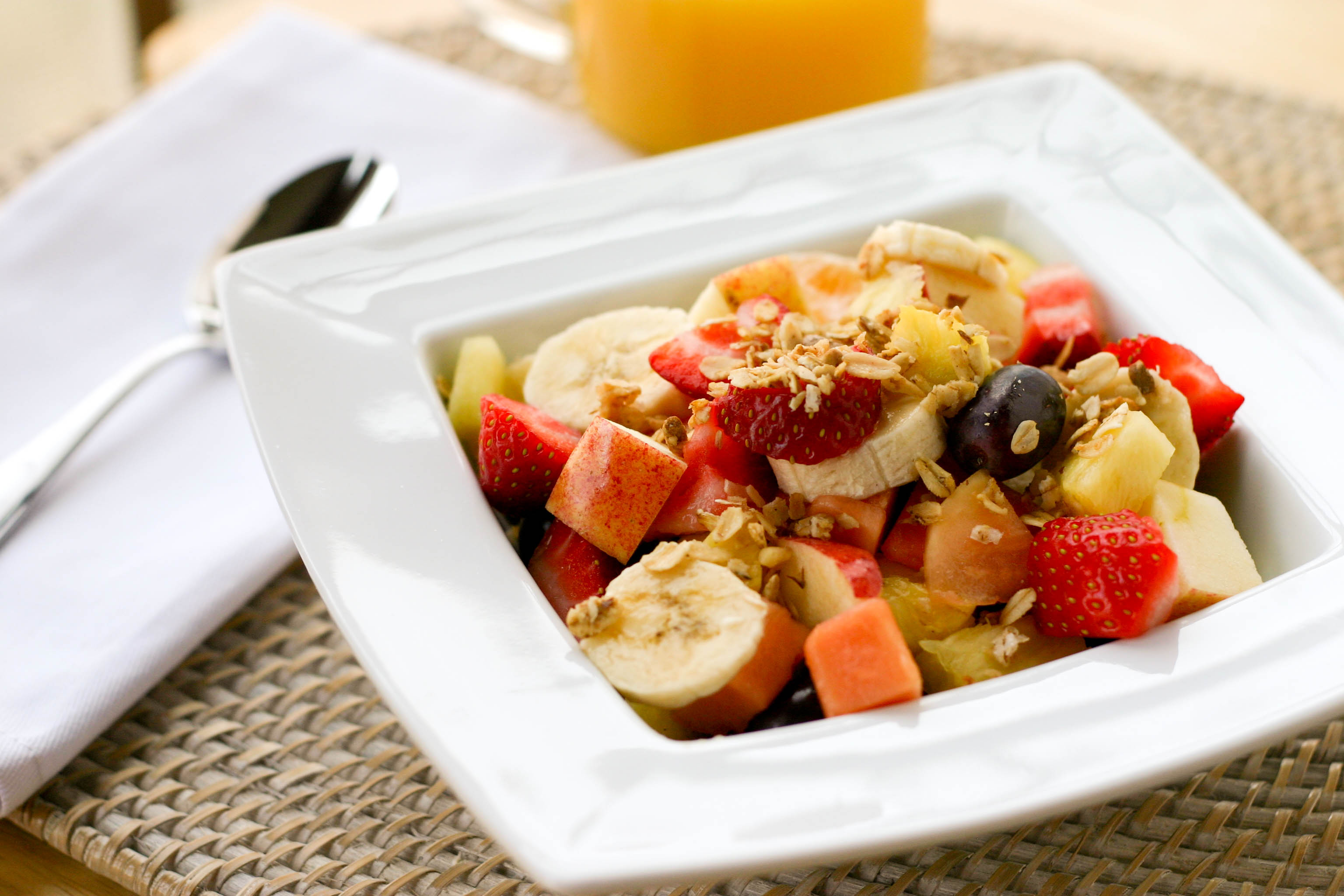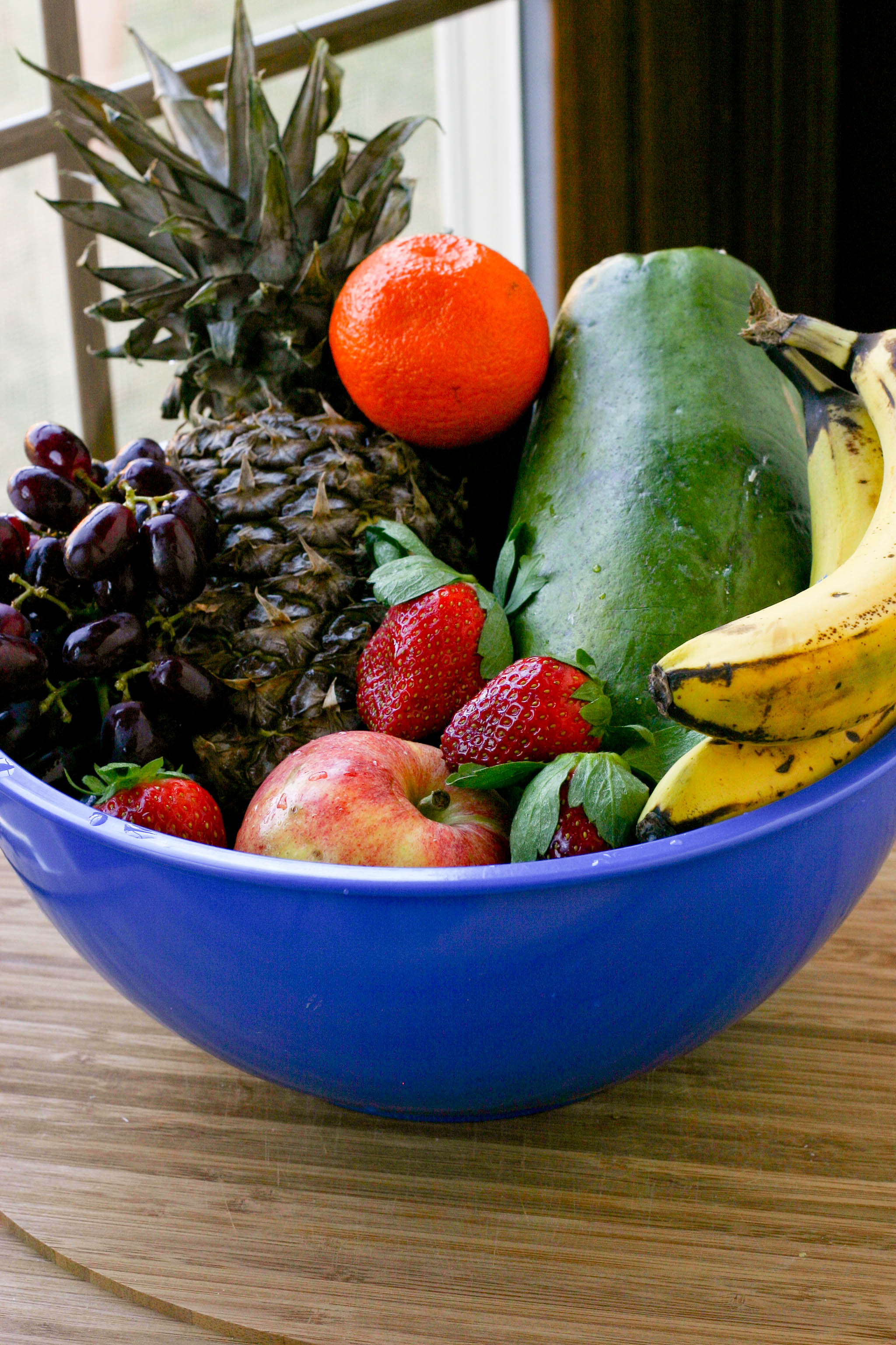 We baked the granola for 15 minutes at 350F, checking it after 10 minutes to make sure it wasn’t getting too crispy. It will burn quickly, so make sure to keep an eye on it. While the granola was baking we turned to our rainbow array of fresh fruit which included fresh pineapple, papaya, strawberries, red grapes, bananas, apples and oranges.