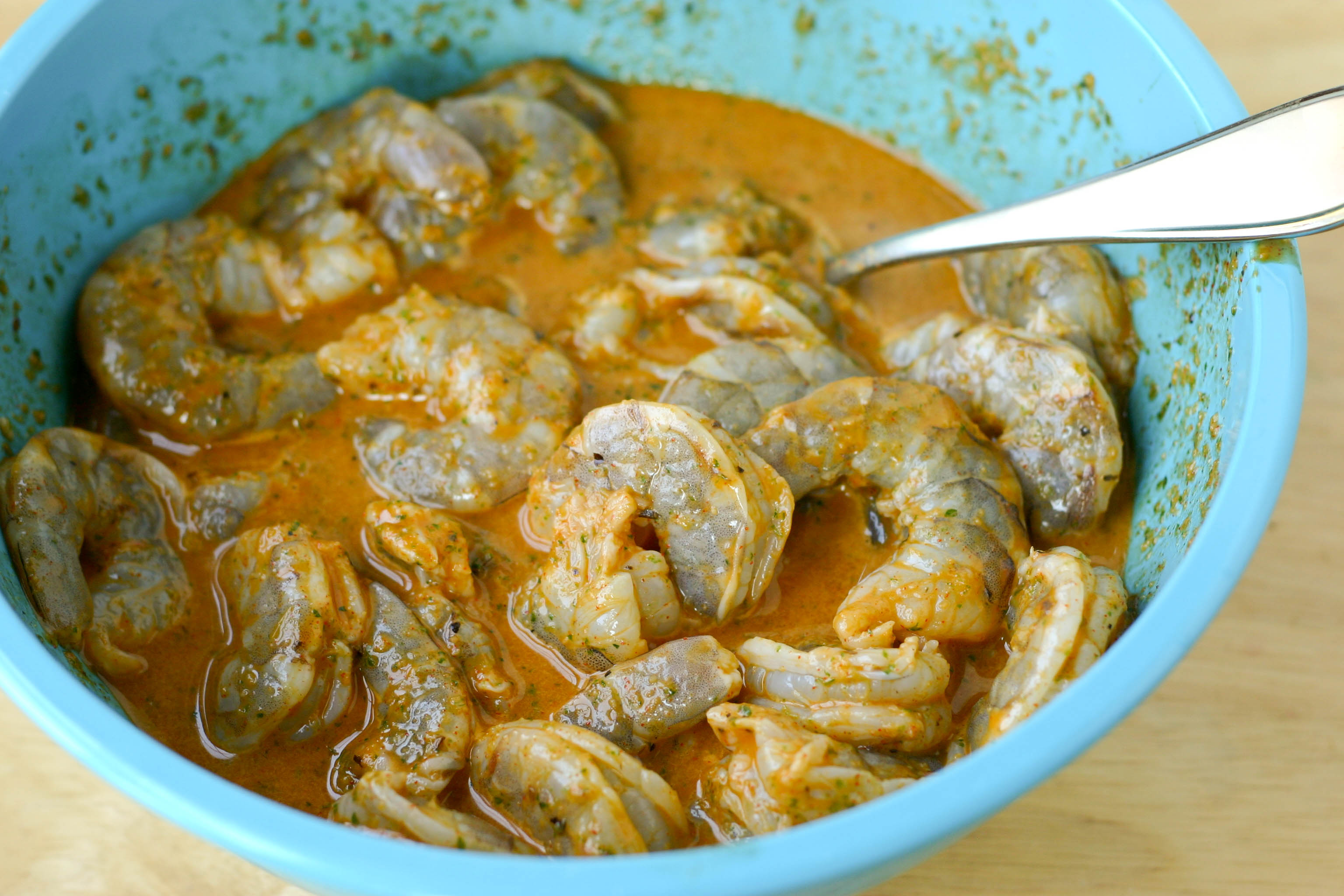 You can see he was very serious about his work (and a bit hungry). Once the sauce was good and smooth he poured it over our raw, peeled and deveined shrimp.