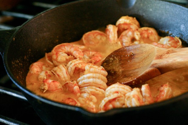 I have to admit, he got me on that one. After about an hour we were ready to get dinner on the table, so we heated up the cast iron skillet and tossed in the shrimp with the sauce. We cooked it for about five minutes, until the shrimp were cooked through and pink.