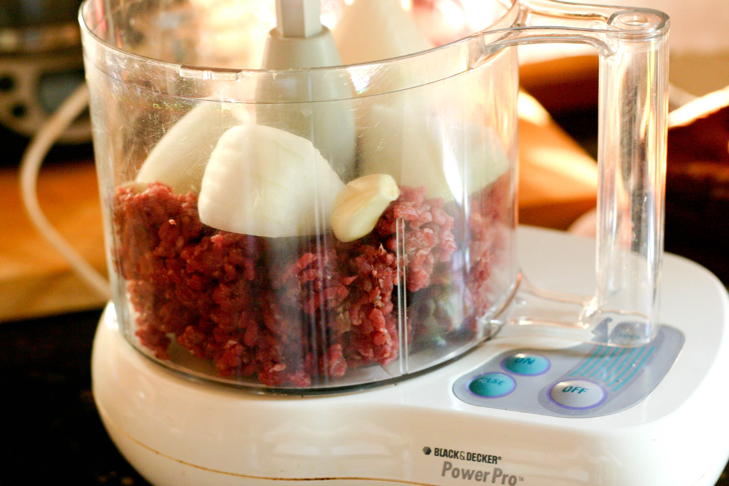 Meanwhile, mix the ground beef with salt, pepper, onion and garlic in the food processor.